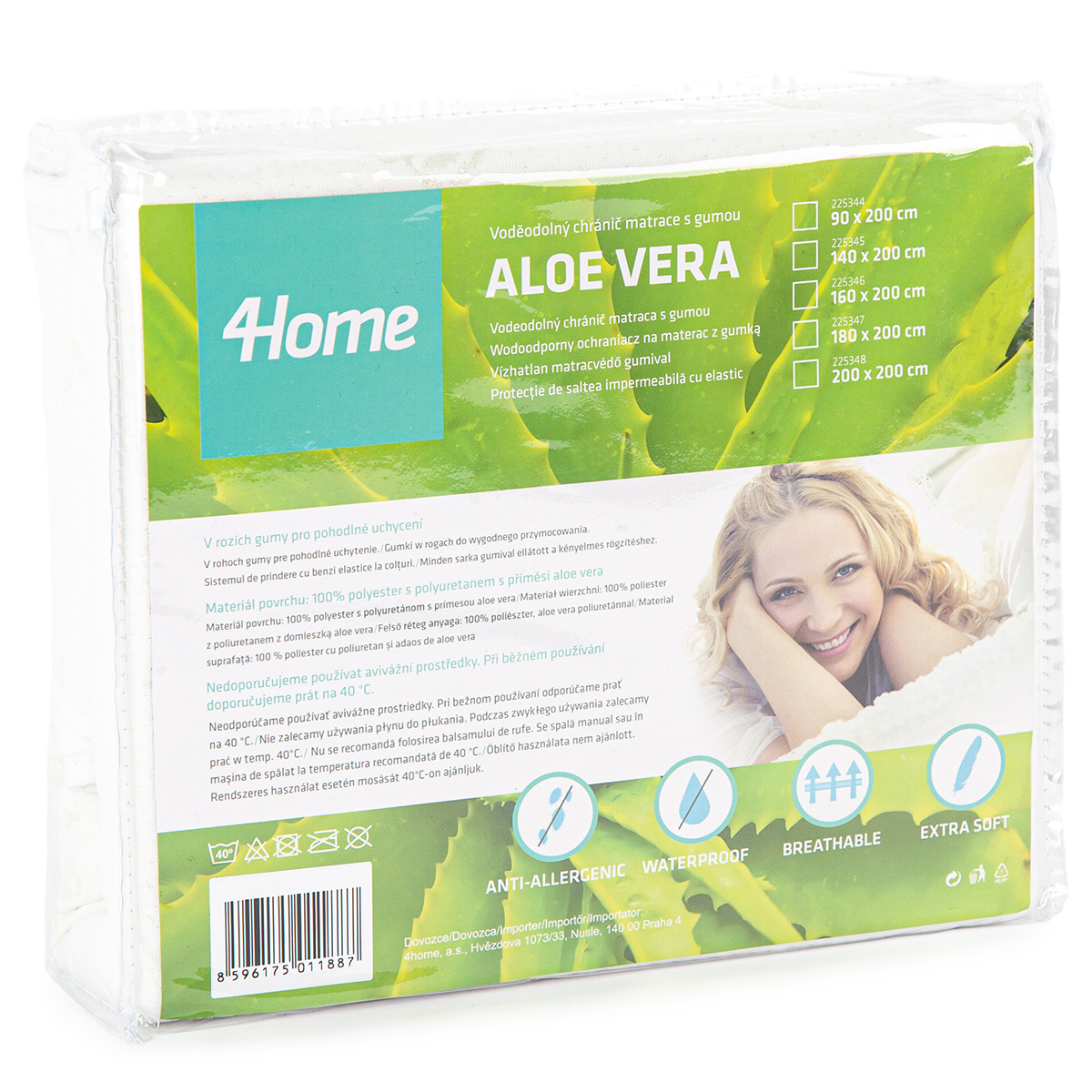 Skvelý pomocník pre zdravý spánok. Tento unikátny nepriepustný chránič matraca Aloe Vera prinesie vašej posteli dokonalú čistotu aj maximálne pohodlie. Je mäkký, priedušný a vďaka obsahu blahodarných výťažkov z Aloe Vera má pozitívne účinky na zdravie (najmä pokožku), pomáha upokojeniu a relaxácii, a navyše sa môže pochváliť antibakteriálnymi vlastnosťami. Pravidelné používanie chrániča predlžuje životnosť vášho matraca a bráni prenikaniu potu aj špiny do matraca, zaručí tak dokonalú hygienu vášho lôžka. Chránič matraca ľahko zvlečiete a vyperiete, takže údržba je takmer bez práce.Vďaka nepriepustnej úprave v podobe polyuretánového záteru sa navyše nemusíte báť žiadnych nepríjemných nehôd, ktoré by nenávratne poškodili váš matrac. Je teda skvelý aj pre deti.V rohoch chrániča sú praktické gumy pre jednoduché uchytenie k matracu – zostane tak vždy na svojom mieste. Je vhodný na matrace s maximálnou výškou 30 cm.Chránič matraca je opatrený certifikátom Öko-Tex Standard 100.
