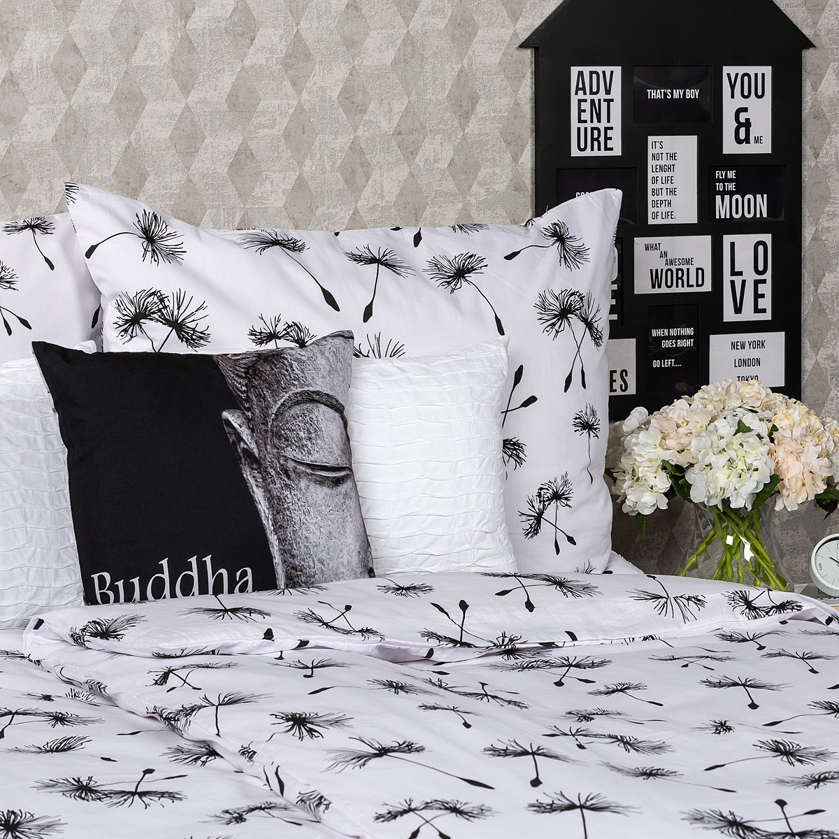 Nechajte sa unášať jemným vánkom rovnako ako letné páperie púpav. Elegantné bavlnené obliečky v tradičnej čiernobielej kombinácii vám prinesú ľahké zaspávanie a svieži doplnok do spálne. Jemný vzor púpavového páperia na kontrastnom bielom podklade je skvelou voľbou pre všetkých, ktorí dávajú prednosť jednoduchému, ale originálnemu dizajnu.