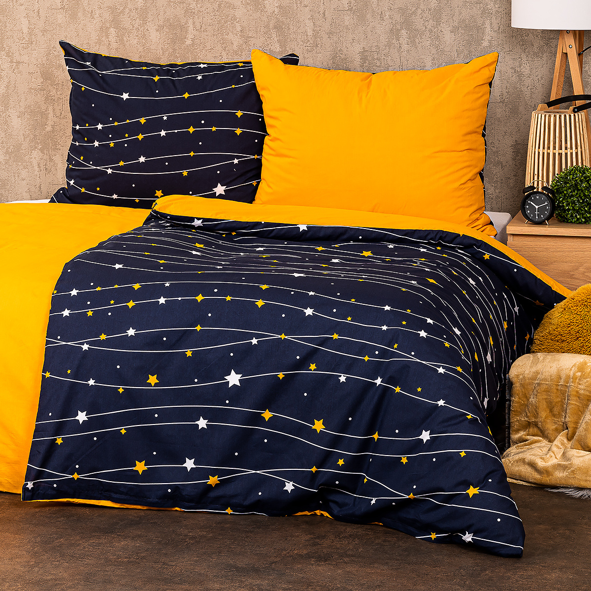 Zaspávajte pod oblohou plnou žiarivých hviezd s originálnymi bavlnenými obliečkami. Kontrastná kombinácia tmavomodrej a žltej dodá vášmu domovu jedinečný štýl. Decentný motív hviezdičiek na tmavomodrom podklade navodí dojem nočnej oblohy pre harmonické zaspávanie. Obliečky sú vyrobené z mäkkej a príjemnej 100% bavlny, ktorá zaručí maximálne pohodlie a kvalitný spánok.Obliečky sú obojstranné – z jednej strany modrej so vzorom, druhá strana je jednofarebná, žltá. Môžete ich teda ľubovoľne kombinovať a meniť svoju posteľ každý deň. Pre maximálne pohodlie majú obliečky praktické zapínanie na zips.Súprava obsahuje:
