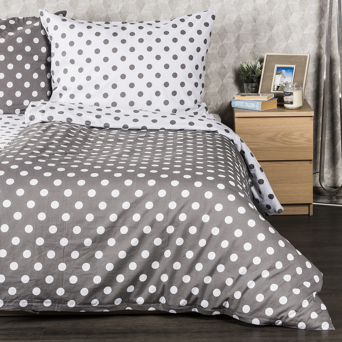 Elegantné potešenie pre každého puntičkára. Rozverné bodky vnesú retro atmosféru do každej spálne a vďaka decentnému sivo-bielemu prevedeniu navyše pôsobia veľmi elegantne. Ideálne bavlnené obliečky pre všetkých s hravou a jemnou dušou. Mäkká a príjemná 100% bavlna vám zaručí kvalitný i pohodlný spánok každú noc, takže sa vždy budete do svojej postele s nadšením vracať.Obliečky sú obojstranné – z jednej strany sivé s bielymi bodkami, z druhej strany biele so sivými bodkami – môžete ich teda ľubovoľne kombinovať a meniť svoju posteľ každý deň. Pre maximálne pohodlie majú obliečky praktické zapínanie na zips.Súprava obsahuje: