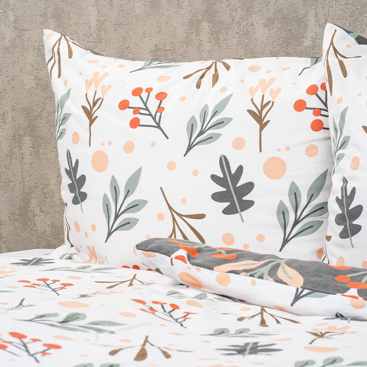 Mäkučké flanelové obliečky s prírodným motívom vás počas chladných nocí rozhodne nenechajú na pospas. Oživte svoju spálňu kombináciou sivých tónov s hrejivými akordmi ružovej a červenej. Prírodné motívy vetvičiek, lístkov a bobuliek dopĺňajú nežné srdiečka, ktoré nenechajú nikoho na pochybách, ako veľmi milujete pohodlný spánok.Jemný bavlnený flanel je vďaka typickému počesaniu krásne mäkký a hrejivý, je teda ideálny pre chladné jesenné a zimné noci. Obliečky sú obojstranné – z jednej strany väčší vzor na sivej, z druhej drobnejší vzor na bielej. Praktické zapínanie na zips.Obliečky na vankúše sú šité z metráže a môžu sa mierne líšiť vďaka rozmanitosti vzoru.Súprava obsahuje: