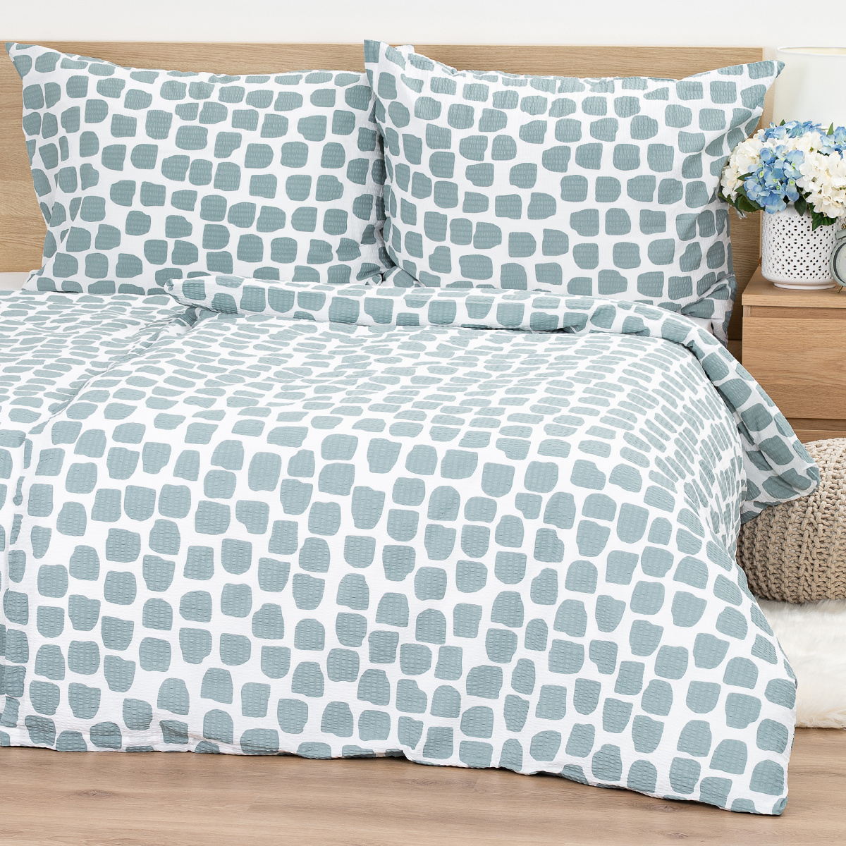 Krepové obliečky Stone od našej vlastnej značky 4Home prinesú do vašej spálne moderný nadčasový dizajn inšpirovaný prírodnými motívmi. Jemný vzor nepravidelných kamienkov v sivasto modrom odtieni na svetlom podklade vytvára minimalistický vzhľad, ktorý sa hodí do každého interiéru.Vyrobené z kvalitného krepového materiálu, obliečky sú ľahučké, vzdušné a veľmi príjemné na dotyk. Nežehlivá úprava ušetrí čas pri údržbe, zatiaľ čo priedušná 100% bavlna zaistí komfortný spánok po celý rok. Praktické zapínanie na zips uľahčuje povliekanie a udržuje prikrývku aj vankúš pevne na mieste.Vďaka jednoduchému elegantnému vzoru sa obliečky skvele hodia ako do moderných, tak klasických spální a vytvoria harmonickú atmosféru.Hlavné výhody produktu: