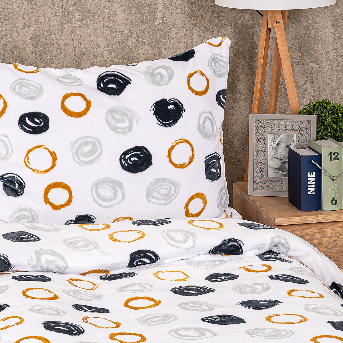Hrejivé mikroflanelové obliečky na zababušenie pre každého zmrzlíka. Spríjemnite si chladné zimné noci s huňatými obliečkami, z ktorých sa vám za žiadnu cenu nebude chcieť ráno vstávať. Univerzálny dizajn v bielej farbe s čiernymi, šedými a zlatistými krúžkami a bodkami môže vašu spálňu zdobiť po celú zimu a zaručene oživí každý domov.Obliečky z mikroflanelu sú krásne mäkké a hrejivé – ideálny spoločník do zimných nocí pre malých i veľkých zmrzlíkov. Mikroflanel rýchlo schne, nemusí sa žehliť ani sa nekrčí a je šetrný aj k citlivej pokožke. Obliečky sú z oboch strán rovnaké a majú praktické zapínanie na zips.Súprava obsahuje: