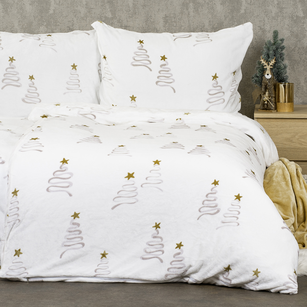Obliečky Christmas tree od značky 4Home vnesú do spálne jemnú vianočnú atmosféru. Čisto biely podklad zdobia decentné štylizované vianočné stromčeky v béžových tónoch doplnené zlatými hviezdami. Obliečky sú obojstranné, pričom dizajn je z oboch strán rovnaký. Jemné farebné ladenie ľahko zapadne do každého interiéru a krásne doplní zimné či sviatočné dekorácie.Mäkký mikroflanel z 100% polyestru s gramážou 240 g/m² ponúka výnimočné pohodlie a hrejivosť. Hebká štruktúra materiálu pripomína zamat a príjemne zahreje v chladných zimných nociach. Látka je odolná, stálofarebná a jemná voči pokožke, takže poskytne pokojný spánok bez podráždenia. Kvalitu a zdravotnú nezávadnosť zaručuje certifikát OEKO-TEX Standard 100, takže sa môžete zababušiť s istotou, že je obliečka bezpečná pre vás aj vašich blízkych.Mikroflanel poteší aj jednoduchou údržbou. Je rýchloschnúci, nekrčivý a nevyžaduje žehlenie, takže vždy zostane krásne mäkký a hebký. Vďaka zapínaniu na zips povlečiete behom chvíľky, bez zbytočnej námahy. Perte pri teplote 40 °C, nesušte v sušičke a nežehlite – materiál si tak zachová svoju jemnosť aj tvar. Obliečky sú určené pre jednolôžko štandard s rozmermi periny 140 × 200 cm a vankúše 70 × 90 cm.Hlavné výhody produktu