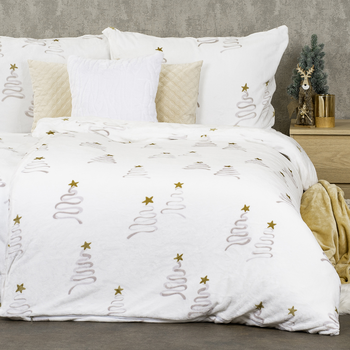 Obliečky Christmas tree od značky 4Home vnesú do spálne jemnú vianočnú atmosféru. Čisto biely podklad zdobia decentné štylizované vianočné stromčeky v béžových tónoch doplnené zlatými hviezdami. Obliečky sú obojstranné, pričom dizajn je z oboch strán rovnaký. Jemné farebné ladenie ľahko zapadne do každého interiéru a krásne doplní zimné či sviatočné dekorácie.Mäkký mikroflanel z 100% polyestru s gramážou 240 g/m² ponúka výnimočné pohodlie a hrejivosť. Hebká štruktúra materiálu pripomína zamat a príjemne zahreje v chladných zimných nociach. Látka je odolná, stálofarebná a jemná voči pokožke, takže poskytne pokojný spánok bez podráždenia. Kvalitu a zdravotnú nezávadnosť zaručuje certifikát OEKO-TEX Standard 100, takže sa môžete zababušiť s istotou, že je obliečka bezpečná pre vás aj vašich blízkych.Mikroflanel poteší aj jednoduchou údržbou. Je rýchloschnúci, nekrčivý a nevyžaduje žehlenie, takže vždy zostane krásne mäkký a hebký. Vďaka zapínaniu na zips povlečiete behom chvíľky, bez zbytočnej námahy. Perte pri teplote 40 °C, nesušte v sušičke a nežehlite – materiál si tak zachová svoju jemnosť aj tvar. Obliečky sú určené pre jednolôžko predĺžené s rozmermi periny 140 × 220 cm a vankúše 70 × 90 cm.Hlavné výhody produktu