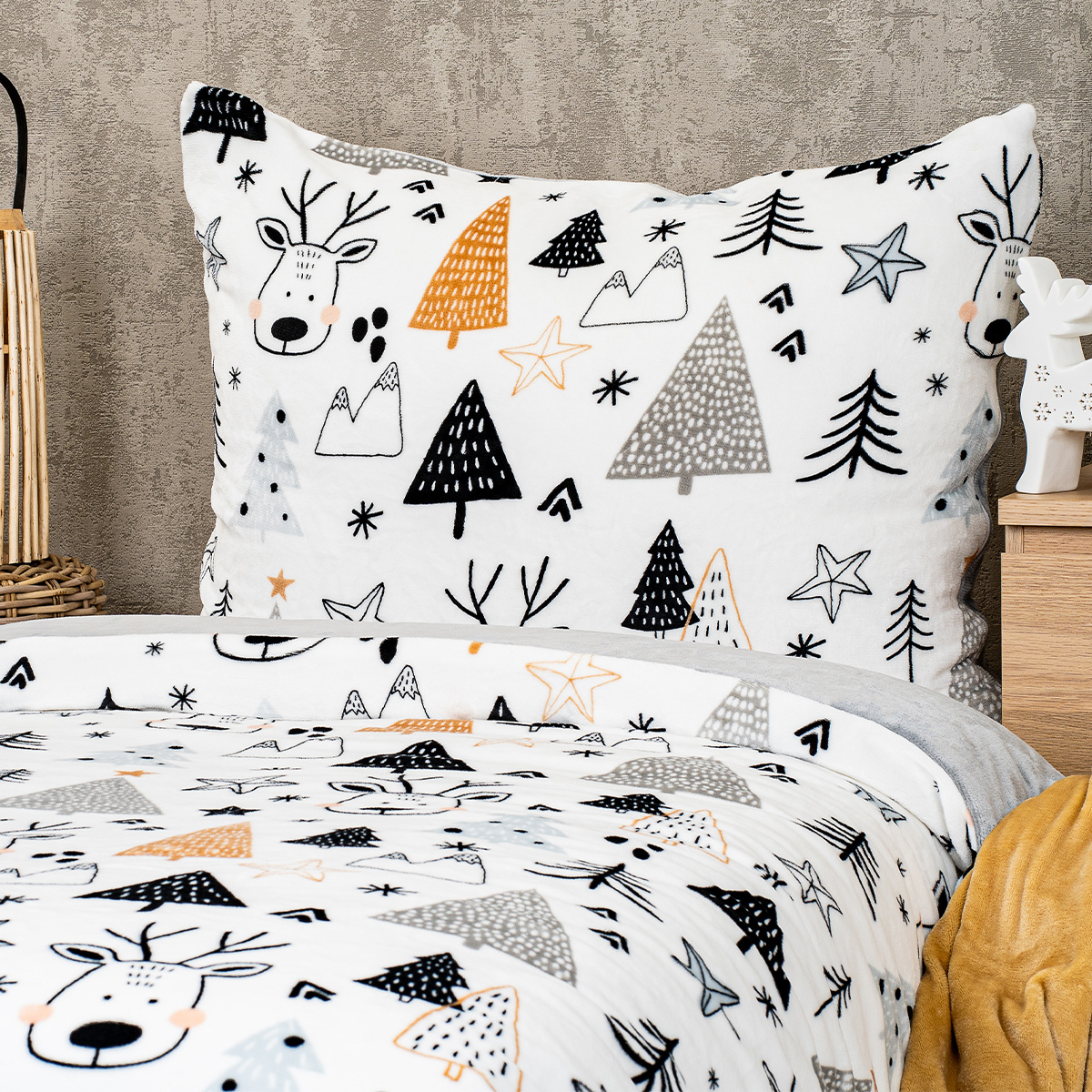 Zababušte sa do jemných obliečok z mikroflanelu a užite si zimu pekne v teple. Motív s veselými zimnými prvkami, ako sú stromčeky, hviezdy a sobíci, vytvára útulnú atmosféru, ktorá vám zaručene spríjemní odpočinok a dodá spálni sviatočný nádych. Vzor v neutrálnych a teplých odtieňoch sivej, čiernej a bielej sa ľahko zladí s rôznymi interiérmi.