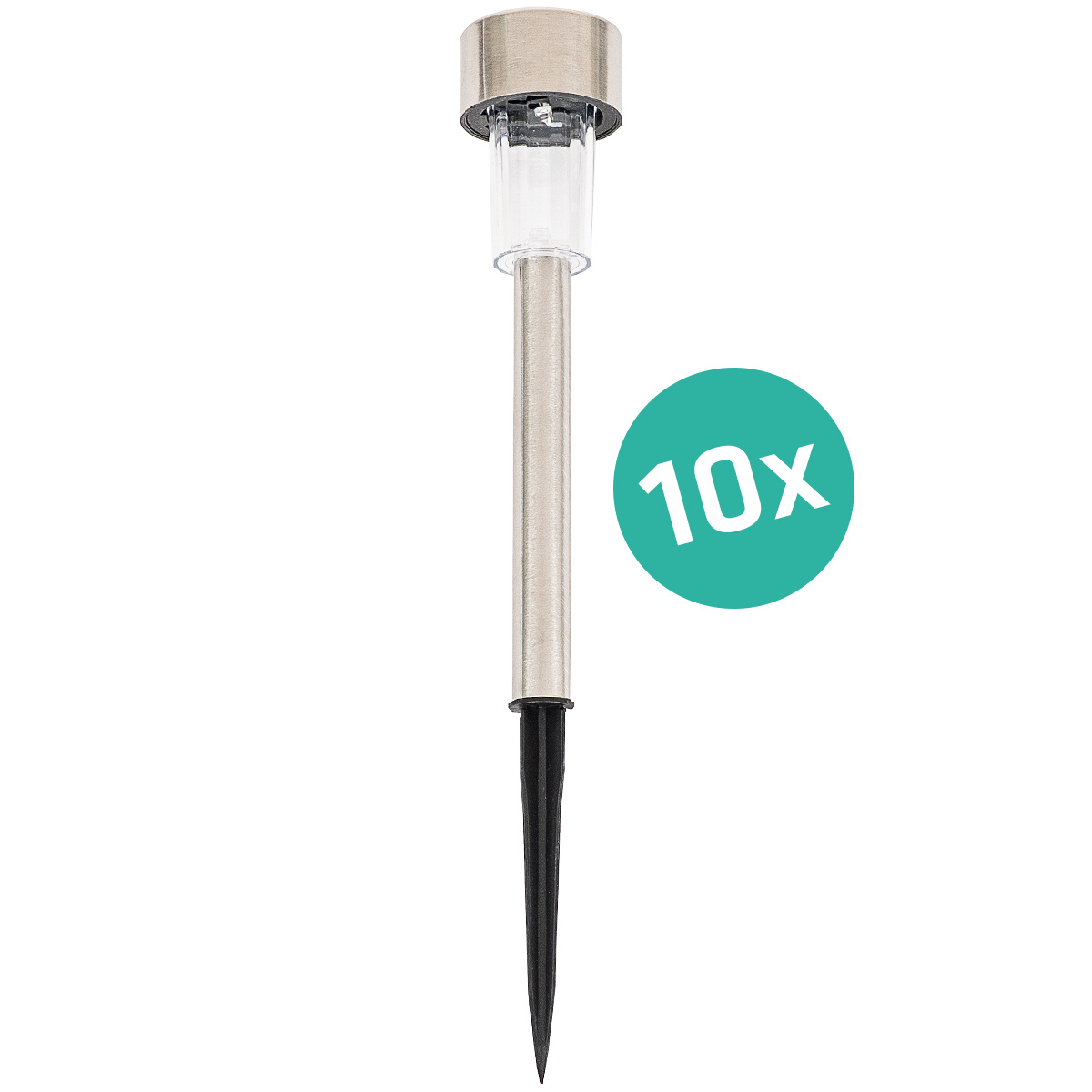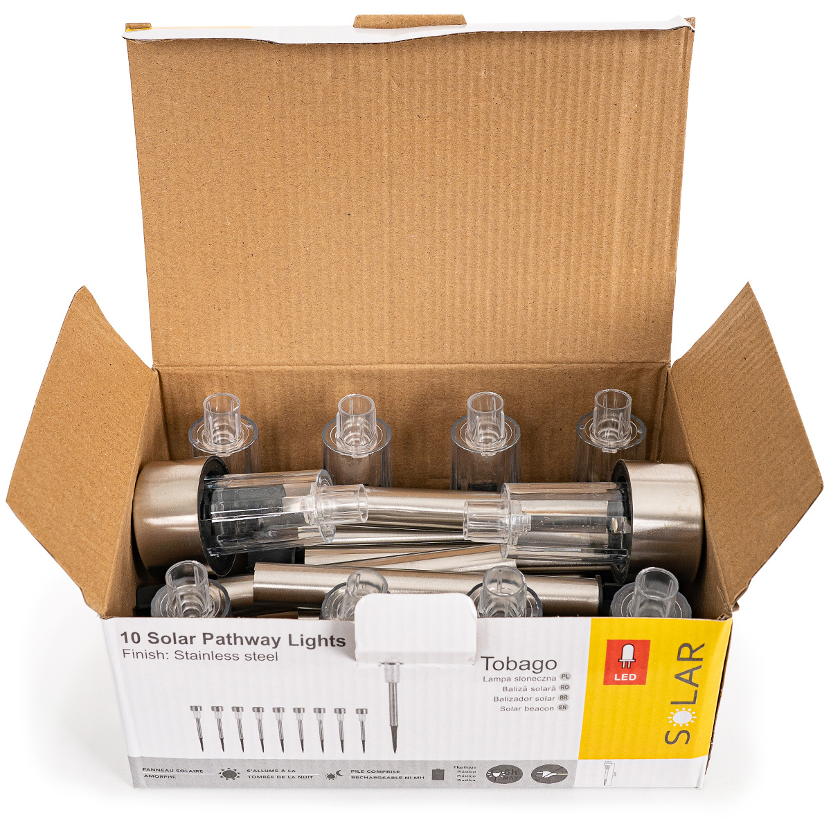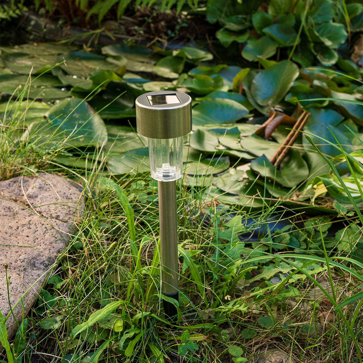 Rozžiarte svoju záhradu, chodníky alebo terasu pomocou praktickej súpravy 10 solárnych LED lámp s príjemným teplým odtieňom svetla. Vďaka jednoduchému a elegantnému dizajnu z nehrdz. ocele a číreho plastu zapadnú tieto lampy do akéhokoľvek exteriéru. Ideálne pre úsporné osvetlenie ciest, záhonov, vchodov aj dekoratívnych prvkov na záhrade.Lampy sa cez deň nabíjajú zo slnečnej energie a po zotmení sa automaticky rozsvietia. Nepotrebujete žiadne káble, elektrinu ani zložité zapojenie – stačí ich pomocou praktického bodca zapichnúť do zeme a o zvyšok sa postarajú samy. Teplé svetlo navodzuje útulnú a pokojnú atmosféru, ideálnu na večerné posedenie alebo bezpečný pohyb po záhrade.Technické parametre a špecifikácie: