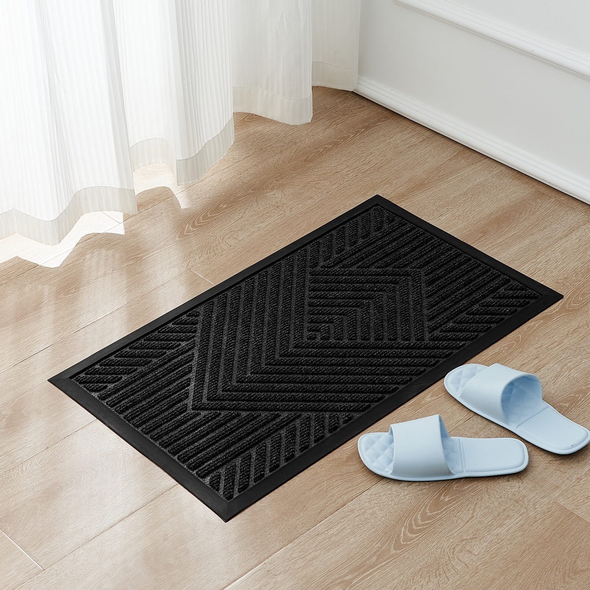 Táto štýlová a funkčná rohožka nielen krásne vyzerá, ale zároveň vám ušetrí veľa práce s upratovaním. Praktická a elegantná čierna farba perfektne maskuje nečistoty, takže aj po dlhšej dobe používania bude rohožka vyzerať stále skvele. Moderný geometrický vzor navyše poskytuje textúru, ktorá napomáha lepšiemu očisteniu obuvi. Je ideálna na umiestnenie pred vstupné dvere, do chodby alebo na terasu, kde zaistí, že sa nečistoty nedostanú do vášho interiéru.Spodná strana je opatrená gumovou protišmykovou vrstvou, ktorá zabraňuje posúvaniu a zaisťuje bezpečnosť pri každodennom používaní. Rohožka sa veľmi ľahko udržuje – stačí ju vyklepať, povysávať alebo opláchnuť vodou, aby zostala čistá.