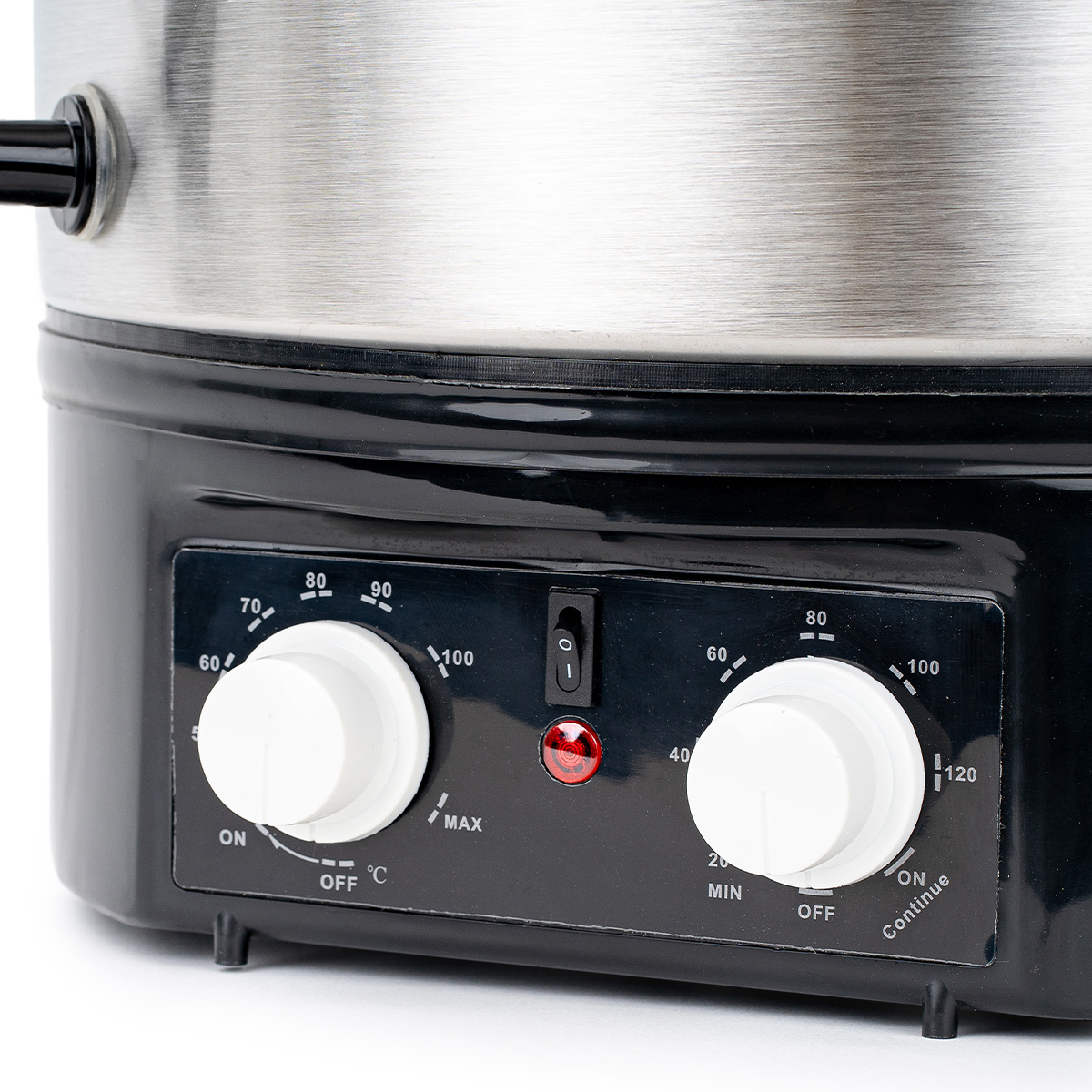 Ovládanie je jednoduché a intuitívne vďaka dvom otočným gombíkom. Prvým nastavíte teplotu v rozsahu od 50 do 100 °C, druhým časovač v rozmedzí od 20 do 120 minút. Po dosiahnutí nastavenej teploty zaznie zvukový signál a po uplynutí zvoleného času sa hrniec automaticky vypne. Nechýba ani bezpečnostná poistka proti prehriatiu, ktorá sa aktivuje v prípade nadmerného zahriatia a chráni tak prístroj aj jeho okolie.