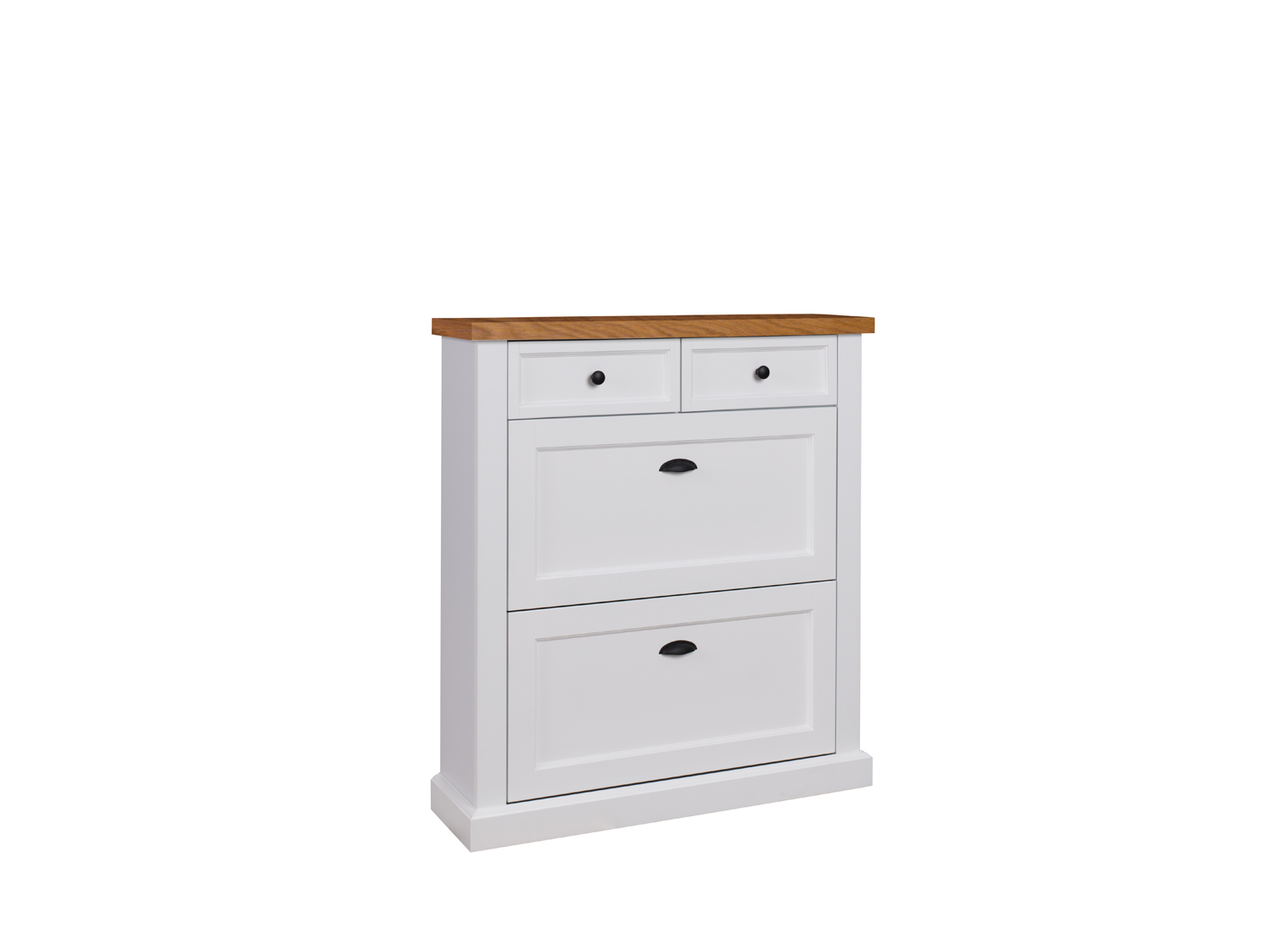 Neodolateľná zostava do predsiene GALINEO v provensálskom štýle. Očarujúca kolekcia Galineo v bielej farbe zaisťuje optické zväčšenie priestoru. Preto je vhodná aj do menších predsieni. Kolekcia Galineo obsahuje viacero prvkov, ktoré Vám ponúkajú možnosť vytvorenia si dokonalej predsiene. Celú kolekciu dopĺňajú elegantné čierne kovové úchyty. Botník na topánky GALINEO P01 ma dve priestranné zásuvky a dve výklopné poličky na topánky.