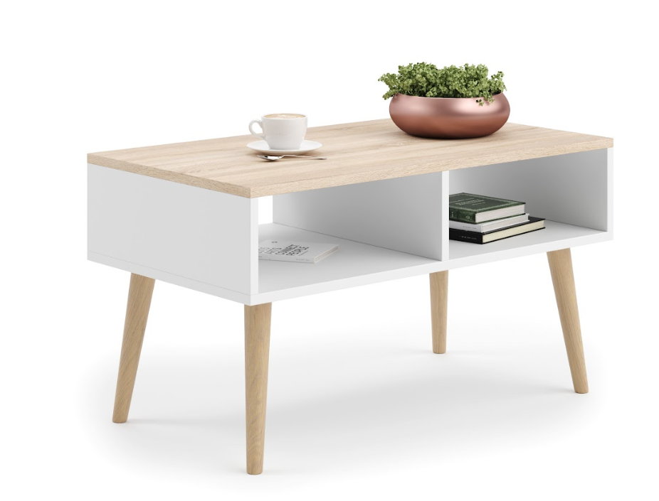 Krásny konferenčný stolík SANA je jednoduchý, moderný a univerzálny stolík do každého interiéru. Stolík SANA sa vyrába peknom farebnom prevedení dub sonoma s klasickou kombináciou bielej, čo zaručuje ľahko-kombinovateľnú kompozíciu s ostatnými prvkami. Konferenčný stolík SANA má dostatok úložného priestoru.