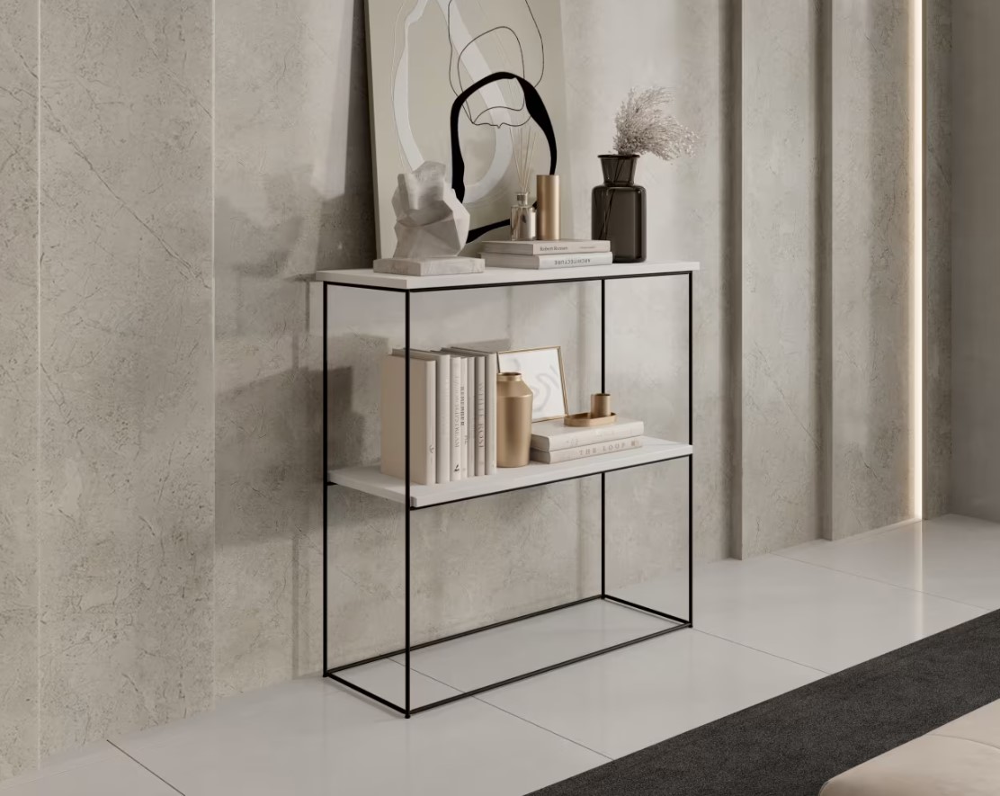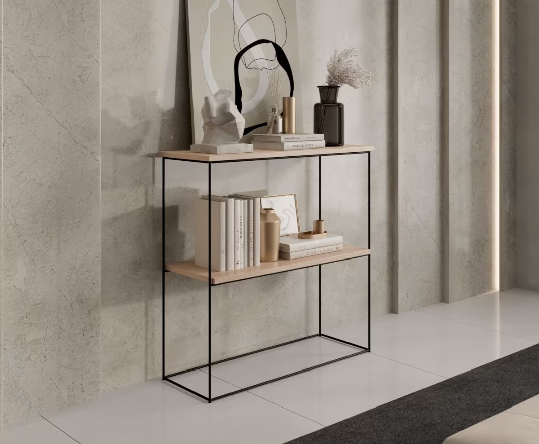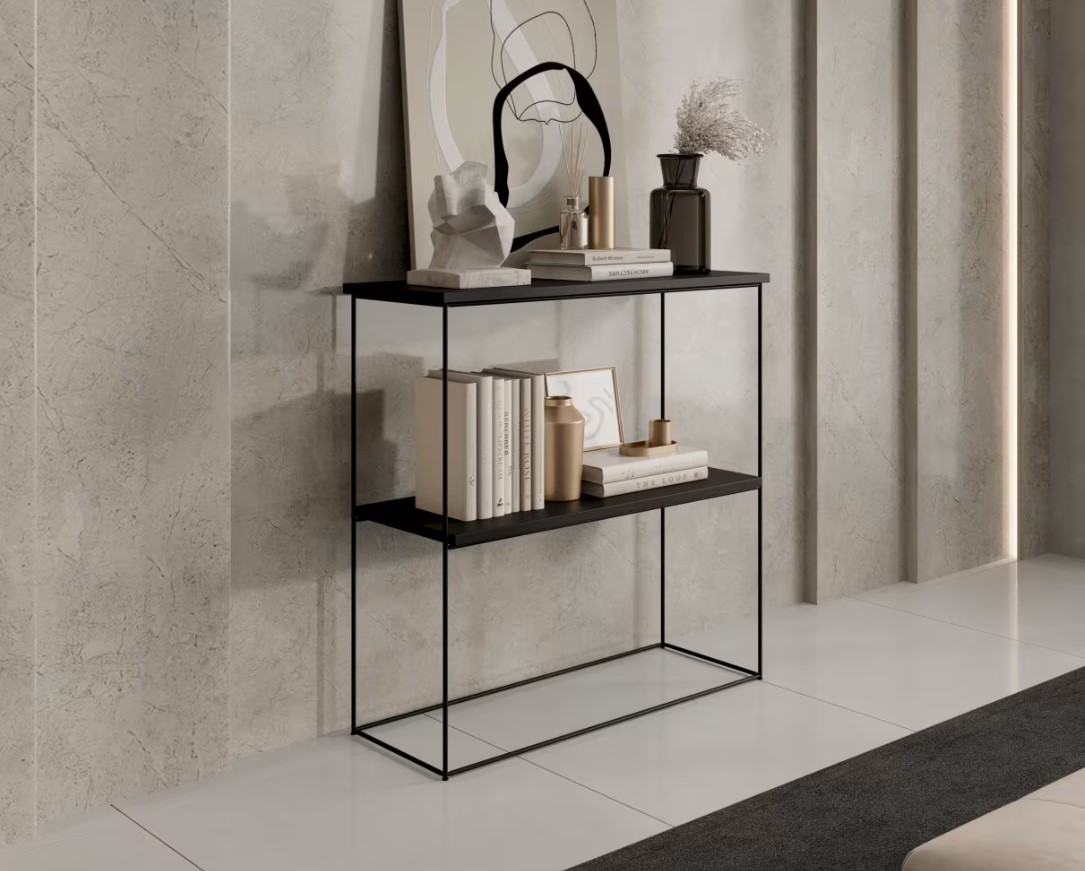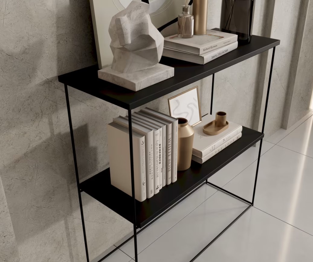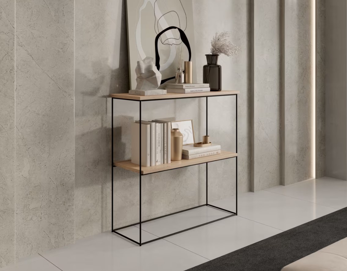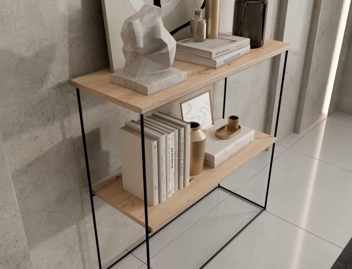 Príručný stolík TONI | čierne nohy predstavuje štýlový a súčasný nábytkový prvok, ktorý sa skvele hodí do rôznych interiérov – od čistých minimalistických až po dynamické prostredie. Jeho dominantným rysom sú nožičky z drôteného materiálu, ktoré konzole dodávajú vzdušnosť a moderný dizajn. Jednoducho tvarovaný vrch harmonizuje s detailne prepracovanou kovovou konštrukciou podnože, čím vzniká vyvážený a esteticky celok. Príručný stolík má možnosť výberu v niekoľkých farebných prevedeniach hornej a spodnej dosky.