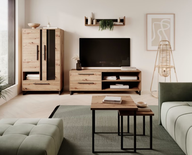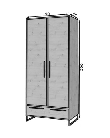 Vysoké nohy, ktorými je šatníková skriňa ARIA vybavená, zabezpečujú dostatok priestoru pod nimi, tento detail vytvára dojem voľnosti a vzdušnosti, ktorý je charakteristický pre loftový štýl. Šatníková skriňa ARIA je dvojdverová a v spodnej časti má praktickú zásuvku, farebná kombinácia pôsobí teplým a útulným dojmom. Zariaďte si obývačku moderne a prakticky so zostavou ARIA.