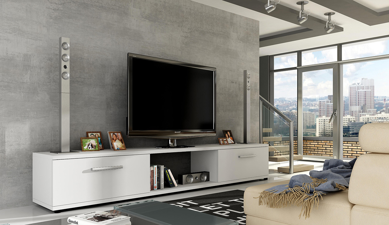 Originálny TV stolík ARIDEA AR02 v krásnom bielom matom farebnom prevedení dokonale zapadne do každej modernej domácnosti. Originálny TV stolík ARIDEA ponúka nadčasový dizajn, ktorý je vhodný do každej modernej domácnosti. Stolík má otvorenú policu a dve priestranné skrinky, ktorú sú výklopné
