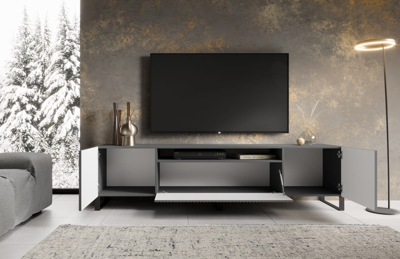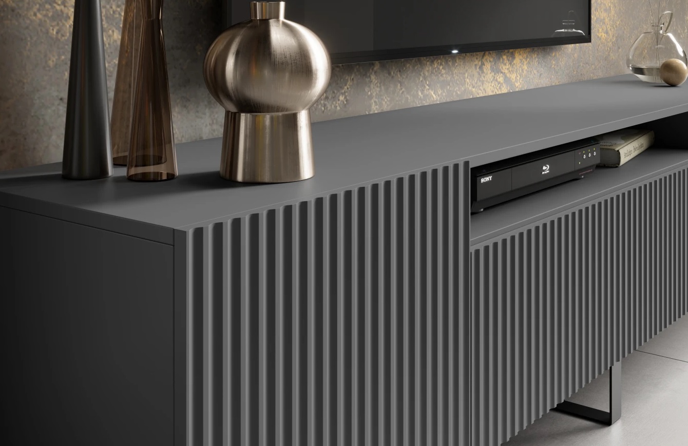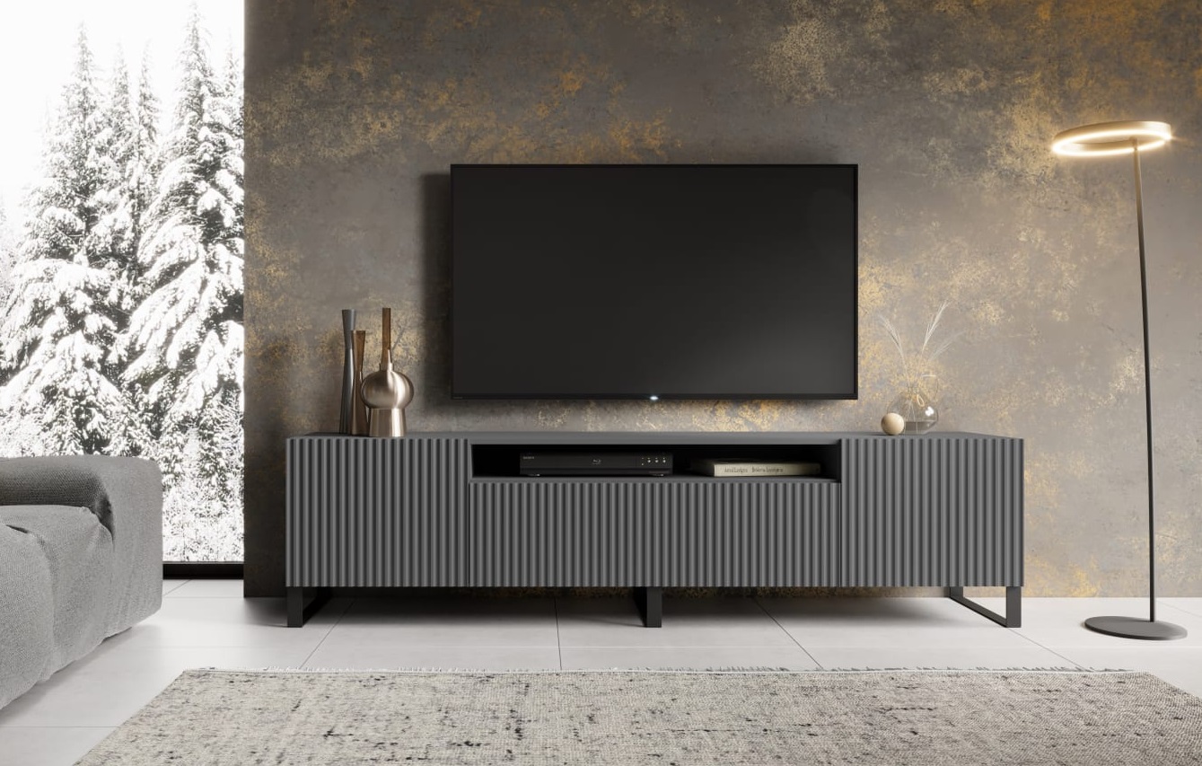 TV stolík NOEMI je štýlový a praktický kus nábytku, ktorý dokonale doplní modernú obývačku. Elegantný dizajn s ryhovaným čelom pôsobí luxusne a zároveň nadčasovo. Premyslené vnútorné usporiadanie ponúka dostatok priestoru na televíznu techniku, príslušenstvo aj drobnosti. Stabilná konštrukcia, kovové nohy v čiernom matnom prevedení a systém otvárania zabezpečujú pohodlné a tiché používanie každý deň. Tv stolík v grafitovom prevedení má dĺžku 200 cm.