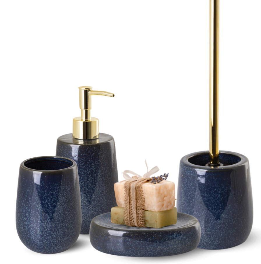 Kúpeľňový set FRIKI ponúka elegantný námornícky modrý odtieň, ktorý dodá vašej kúpeľni štýlový nádych. Jeho originálny škvrnitý dizajn prináša zaujímavý vizuálny prvok, ktorý oživí akýkoľvek interiér. Moderný vzhľad setu sa ľahko prispôsobí rôznym štýlom a ponúka ideálnu kombináciu praktickosti a estetickej príťažlivosti.