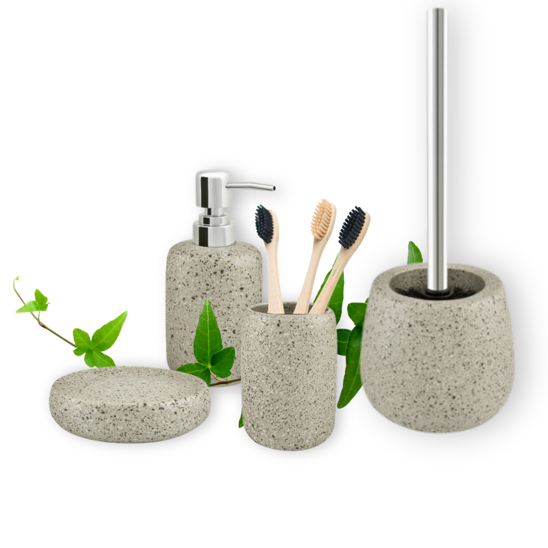 Kúpeľňový set HERMIDA je vyrobený z kvalitnej a odolnej kameniny. Starostlivosť oň je mimoriadne jednoduchá – stačí ho utrieť vlhkou handričkou