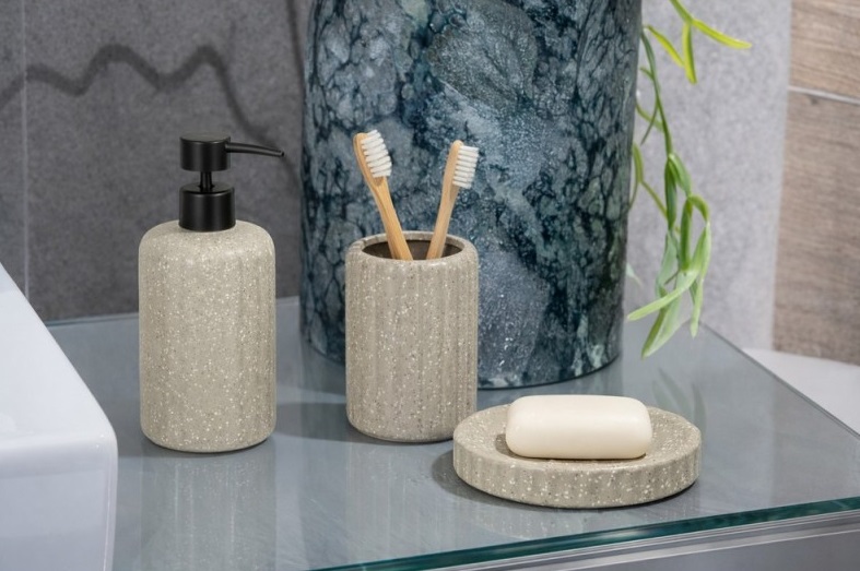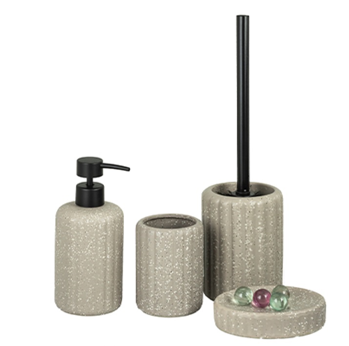 Kúpeľňový set PERU je elegantný a praktický doplnok do kúpeľne v hnedom odtieni. Prírodná farebnosť a jemná štruktúra materiálu dodávajú výrobku teplý a dekoratívny vzhľad, vďaka čomu sa výborne hodí do interiérov inšpirovaných prírodou, boho štýlom, japandi alebo moderným minimalizmom. Dávkovač je vybavený čiernou matnou pumpičkou, ktorá vytvára štýlový kontrast s kameninovým telom a umožňuje pohodlné dávkovanie optimálneho množstva mydla. Objem 450 ml zaručuje praktické využitie nielen v domácich kúpeľniach, ale aj v hoteloch či apartmánoch.