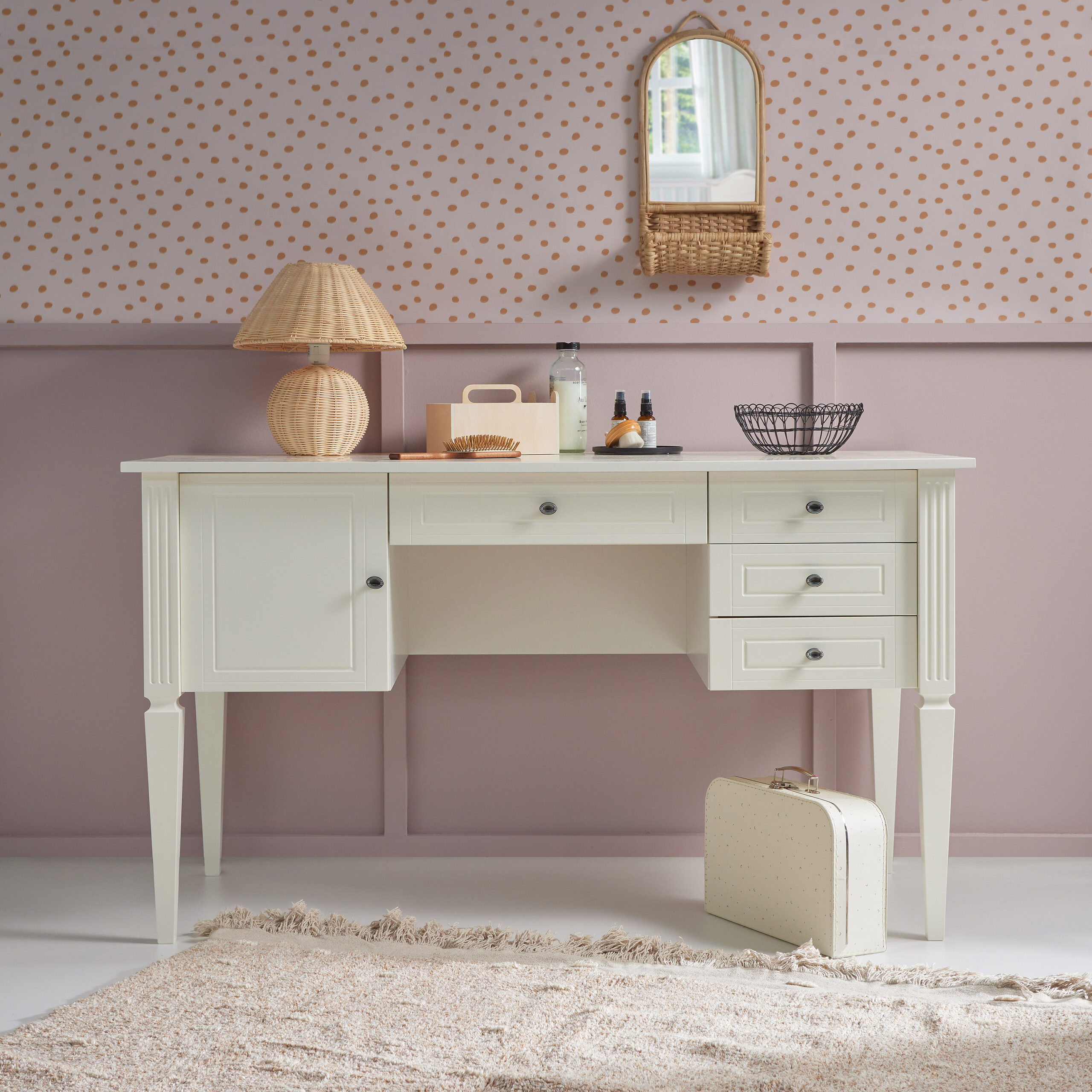 Elegantný detský sektorový nábytok INES je navrhnutý špeciálne pre našich najmenších. Detský – baby nábytok INES sa skladá z 11 komponentov, z ktorých si vyberiete práve to čo potrebujete a vytvoríte vašej ratolesti detskú izbu podľa svojich potrieb a predstáv. Zostavu detského – baby nábytku je možné ľubovoľne kombinovať a to i vďaka tomu že ponúka dve moderné farebné prevedenia. Súčasťou tejto dokonalej kolekcie detského nábytku je aj písací stolík INES, ktorý je vyrobený z kvalitných a pre dieťa bezpečných materiálov. Dokonalosť detskému stolíku dávajú porcelánové úchytky a frézovanie. Pre komfort a bezpečnosť sú použité koľajnice BLUM, ktoré slúžia pre tichý chod a spomaľovacie zatváranie zásuviek. Detský písací stolík má 1 dvierka a 4 zásuvky.