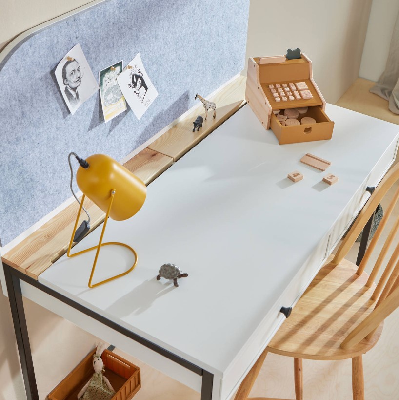 Zostava LUMI vyniká svojou jednoduchosťou a minimalistickým dizajnom. Vytvorí v detskej izbe ideálne prostredie pre rast vášho dieťatka. Kolekcia je vyrobená v nežnej bielej farbe, je oživená čiernymi nohami a úchytkami. Písací stolík LUMI na vysokých nohách s dvomi zásuvkami a s dvomi odkladacími priehradkami v zadnej časti stola. Stolík je vybavený aj otvorom pre vedenie káblov, aby sa zabránilo zbytočnému neporiadku. Za stolík je možné doobjednať panel. Vytvorte doma priestor, kde môže vaše dieťatko rásť a snívať.