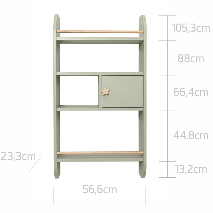 Krásny regál z kolekcie RAINBOW sa ideálne hodí pre potreby najmenších aj väčších detí. Je vybavený skrinkou a tromi policami, vďaka čomu je veľmi funkčný a priestranný. Regál sa dá namontovať nad stôl, posteľ aj nízko na podlahu, čo umožňuje ľahký prístup ku knihám, hračkám a iným drobnostiam. Dve police sú ukončené drevenou zarážkou, ktorá dodatočne chráni knihy proti vypadnutiu. Neváhajte a objednajte si k regálu písací stolík LOTTA v rovnakom štýle a zlaďte si detskú izbu do posledného detailu. Rôzne typy stien vyžadujú rôzne typy upevnenia; vždy používajte skrutky, ktoré sú vhodné na steny vo vašej domácnosti.