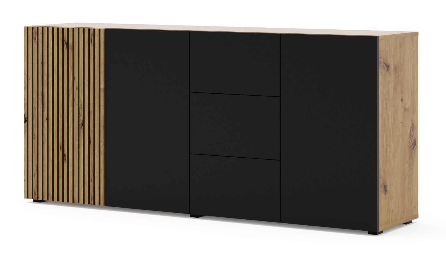 Vytvorte si z vašej obývačky atraktívny priestor so zostavou AURIS a zariaďte si interiér moderne a útulne zároveň. Kolekcia AURIS obsahuje množstvo prvkov a jednoduché línie oživujú lamely, ktoré nesmú chýbať v žiadnej modernej obývačke. Kombinácia dekoru dub artisan s čiernou farbou je ideálnym riešením do svetlých interiérov. Komoda AURIS 3D3S má 3 praktické dvierka a 3 zásuvky, oceníte veľa úložného priestoru. Nechýbajú ABS hrany.