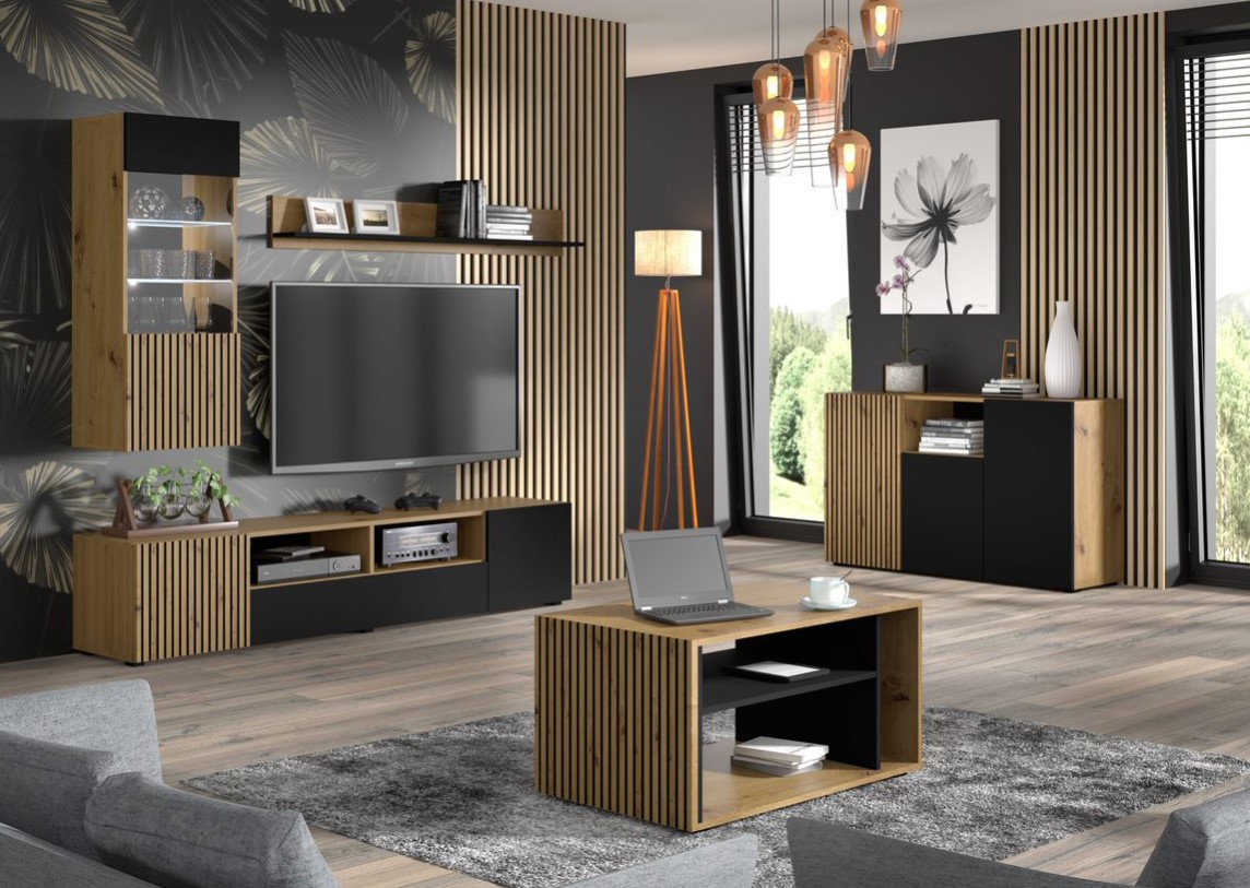 Vytvorte si z vašej obývačky atraktívny priestor so zostavou AURIS a zariaďte si interiér moderne a útulne zároveň. Kolekcia AURIS obsahuje množstvo prvkov a jednoduché línie oživujú lamely, ktoré nesmú chýbať v žiadnej modernej obývačke. Kombinácia dekoru dub artisan s čiernou farbou je ideálnym riešením do svetlých interiérov. Komoda AURIS 4D má 4 praktické dvierka a 2 otvorené police, komodu môžete tak oživiť knihami alebo dekoráciami.