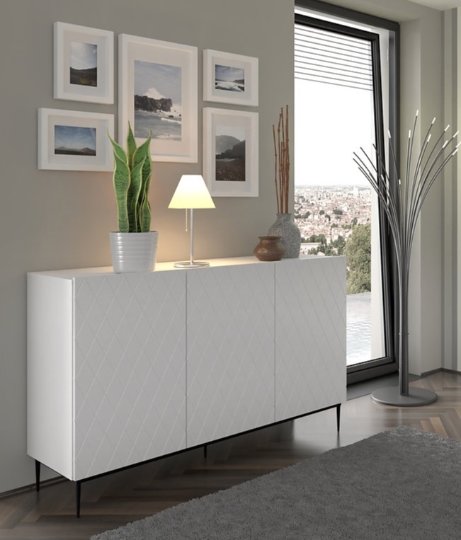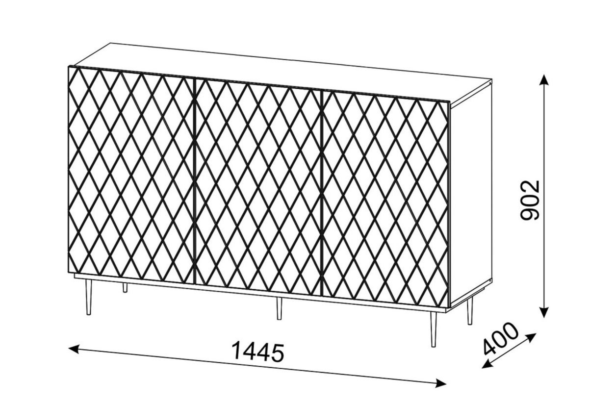 Nadčasová komoda DIUNA 145 3D v bielom matnom farebnom prevedení. Moderný dizajn komody DIUNA sa odvíja od minimalistických línií a pôsobivých detailov. Komoda Diuna má bezúchytkový systém – čelá sa otvárajú systémom push to open. Na doplnenie štýlu má komoda nohy zlaté alebo čierne kovové. Dizajn predných častí komody DIUNA sa vyznačuje pôsobivými dekoráciami v podobe kosoštvorcov, ktoré oslovia milovníkov geometrickej presnosti.