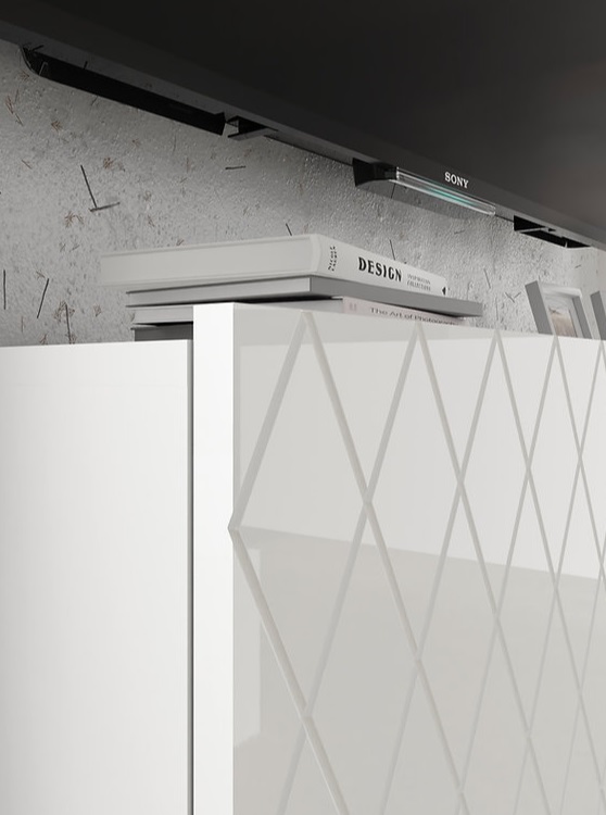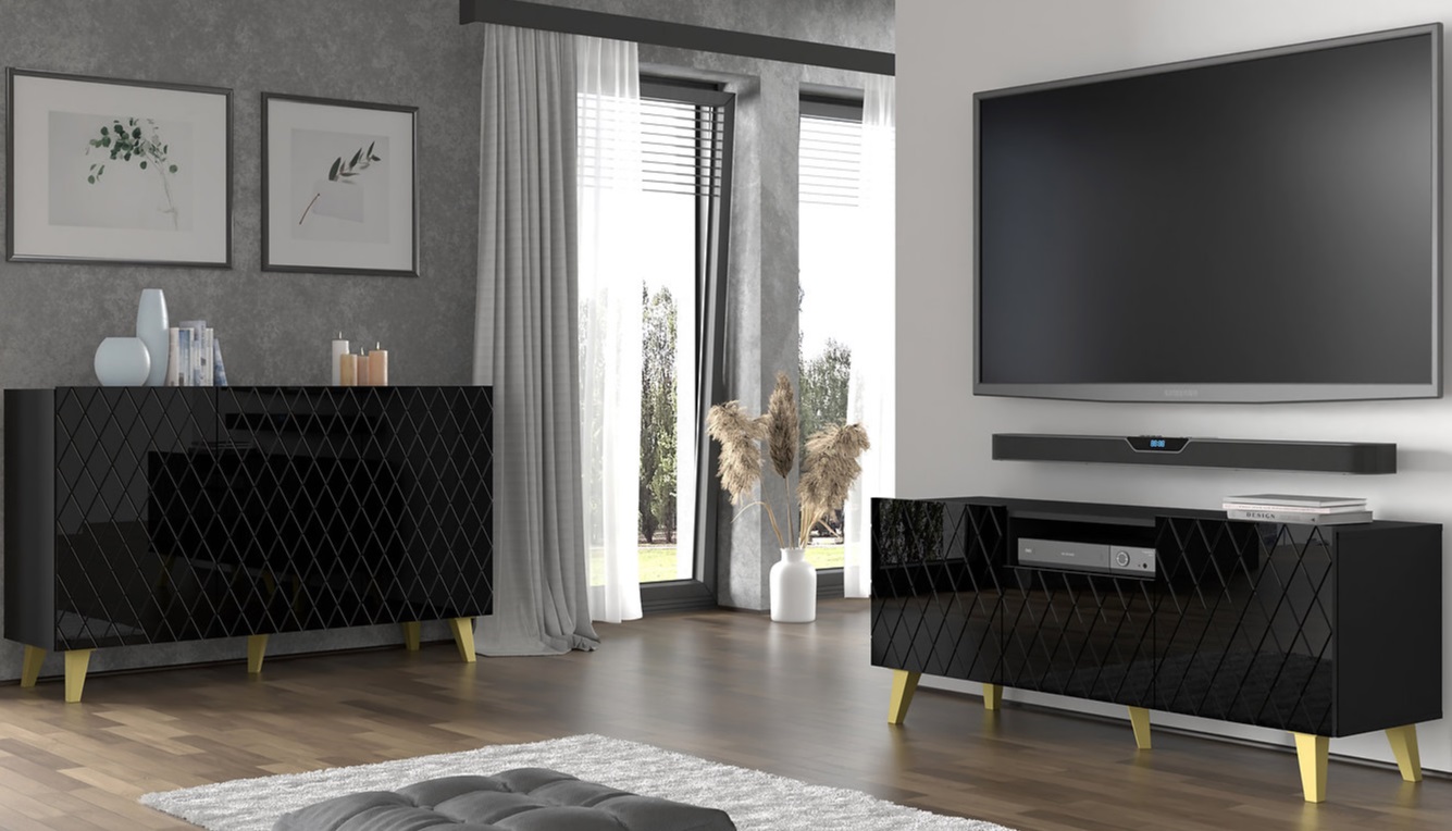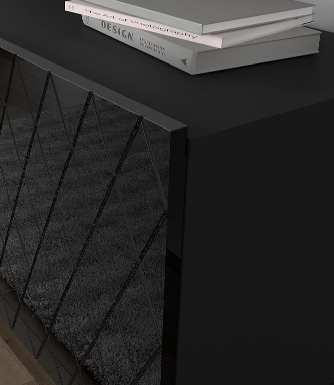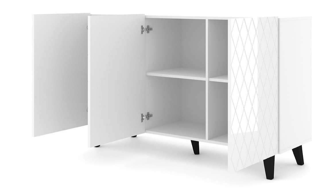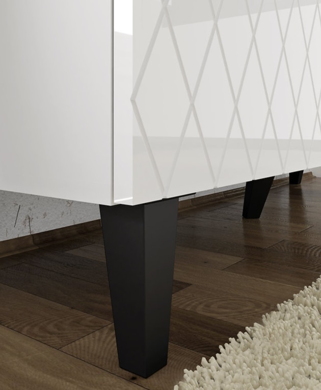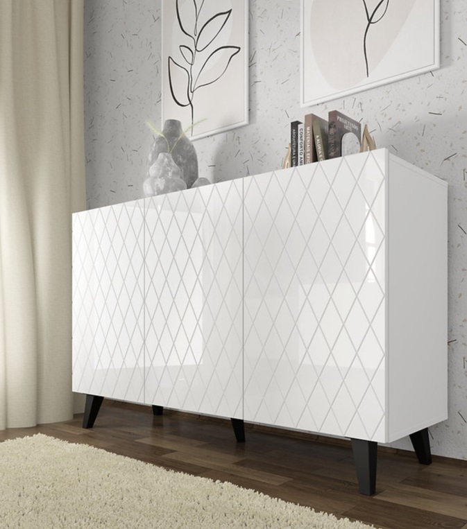Nadčasová komoda DIUNA 145 3D v čiernom a bielom farebnom prevedení v lesku predných častí. Moderný dizajn komody DIUNA sa odvíja od minimalistických línií a pôsobivých detailov. Komoda Diuna má bezúchytkový systém – čelá sa otvárajú systémom push to open. Na doplnenie štýlu má komoda nohy zlaté alebo čierne plastové. Dizajn predných častí komody DIUNA sa vyznačuje pôsobivými dekoráciami v podobe kosoštvorcov, ktoré oslovia milovníkov geometrickej presnosti.