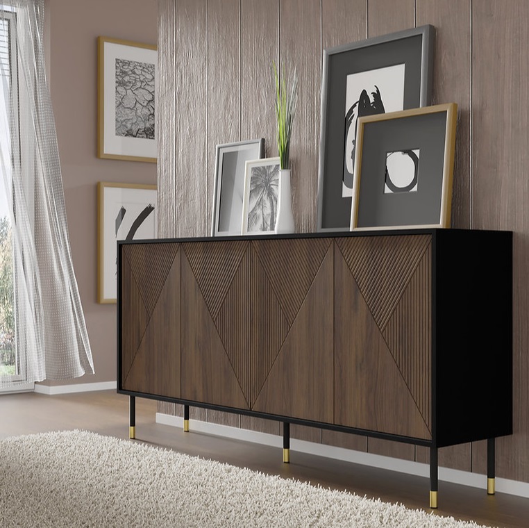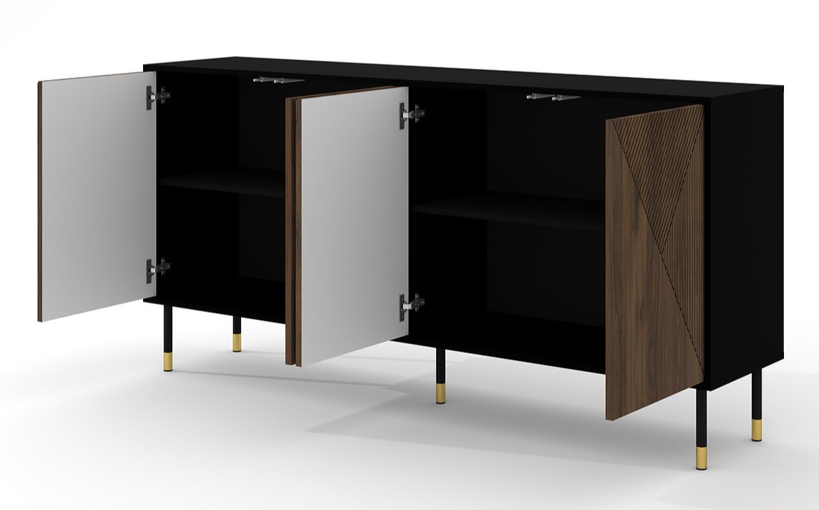 Nadčasová komoda WOODY je štýlová ponuka nielen do obývačky, ktorá dodá interiéru eleganciu a jedinečný charakter. Čierna farba komody WOODY symbolizuje štýl a zároveň pôsobí univerzálne v kombinácií s hnedou farbou. Zlaté prvky na nohách vytvára dojem luxusu. Taktiež komoda WOODY má PUSH TO OPEN j eto otváranie bez- úchytové.