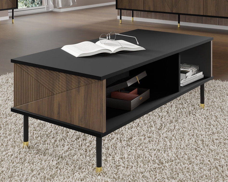 Nadčasový konferenčný stolík WOODY je štýlová ponuka do obývačky, ktorá dodá interiéru eleganciu a jedinečný charakter. Čierna farba konferenčného stolíka WOODY symbolizuje štýl a zároveň pôsobí univerzálne v kombinácií s hnedou farbou. Zlaté prvky na kovových nohách vytvára dojem luxusu.