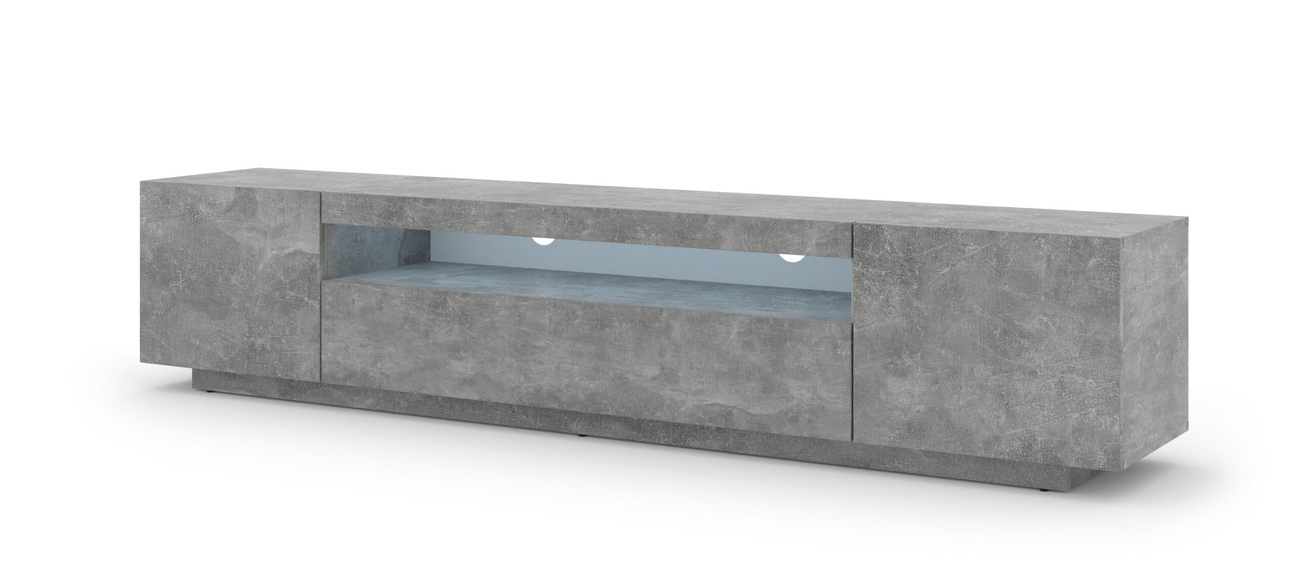 Nápaditý TV stolík AURA v príjemnej farbe betón – sivá poslúži nielen v obývačke, ale aj v izbe tínedžera. Stolík je možné zmontovať na stenu alebo ako samostatne stojaci. Jeho moderný dizajn sa skvele hodí k rôznym štýlom interiéru a dodáva im súčasný charakter. TV stolík má jednu otvorenú policu a tri uzavreté skrinky, z ktorých dve sa otvárajú do strán a jedna smerom nadol. K stolíku je možné objednať LED s osvetlenie v modrej farbe.