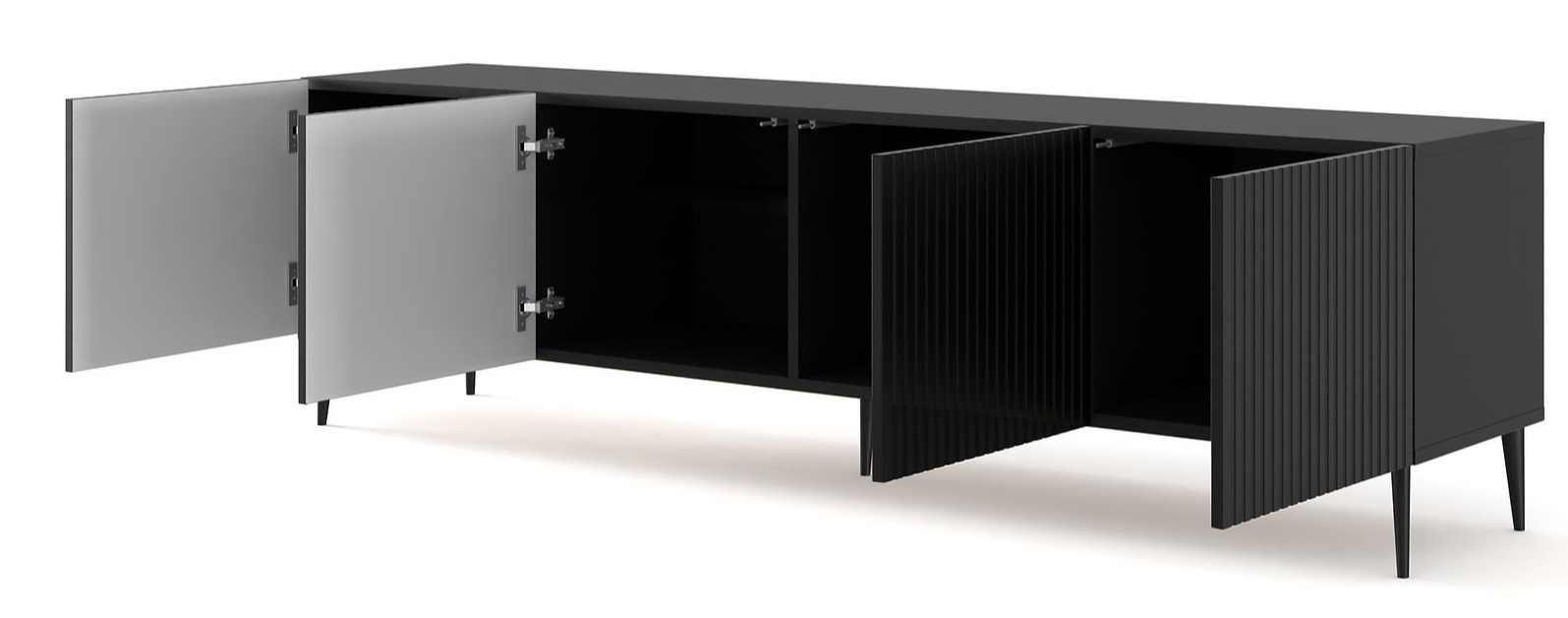 Moderný tv stolík RAVENNA B 4D 200 už svojím názvom naznačuje, že ide o kolekciu nábytku vyrobenú v nádhernom nadčasovom farebnom prevedení čierna matná. Tv stolík RAVENNA B má bezúchytkové frézované čelá, ktoré dokonale ladia. Dizajn tv stolíka RAVENNA, ktorý zodpovedá najnovším trendom pridávajú nohy, ktoré sú čiernom alebo aj v zlatom prevedení. Stolík je priestranný so štyrmi dvierkami.