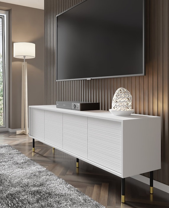 Tv stolík SHERWOOD obsahuje štýlový dizajn, ktorý krásne zapadne do modernej obývačky. Tento dizajn tv stolíka SHERWOOD je ideálny pre tých, ktorí chcú kombinovať klasickej krásy nábytku s modernými prvkami, ako sú čierne nohy a zlaté ozdoby. Najnovšie trendy tv stolíka SHERWOOD je vďaka unikátnym čelám s horizontálnymi frézovaním. Tv stolík má systém otvárania PUSH TO OPEN. Výška je uvedená s nohami 60 cm.