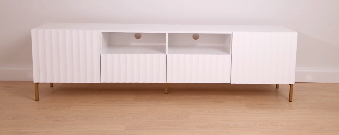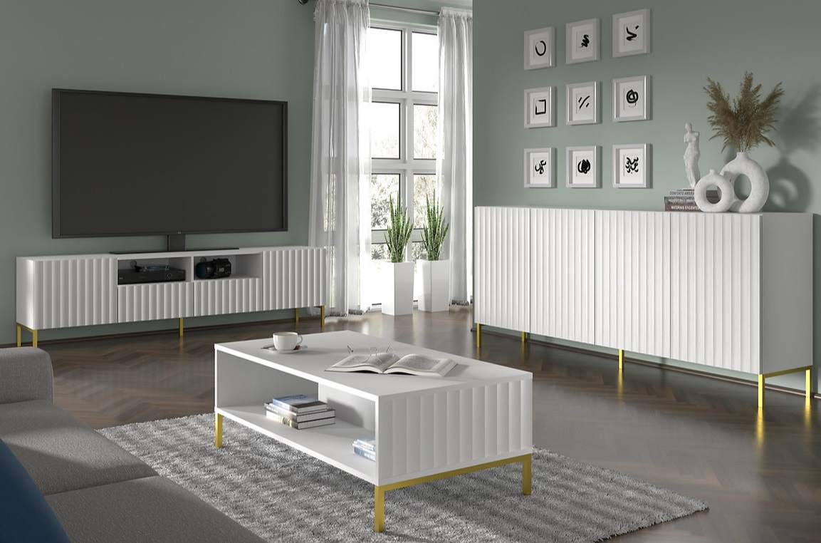 Hľadáte spôsob, ako organizovať svoje veci v obývacej izbe, spálni alebo chodbe, nábytok WAVE je ideálnym riešením. Tv stolík WAVE je vyrobený v bielej a čiernej farbe s možnosťou kombinácie nôh. Nohy sú v zlatej alebo čiernej farbe čo vytvára kontrastný vizuálny efekt, ktorý pridáva do vášho interiéru štýlový nádych. Luxusný vzhľad a eleganciu pridávajú tv stolíku WAVE frézované detaily. Výška je uvedená s nohami 56 cm. Stolík má dva otvory na káble.