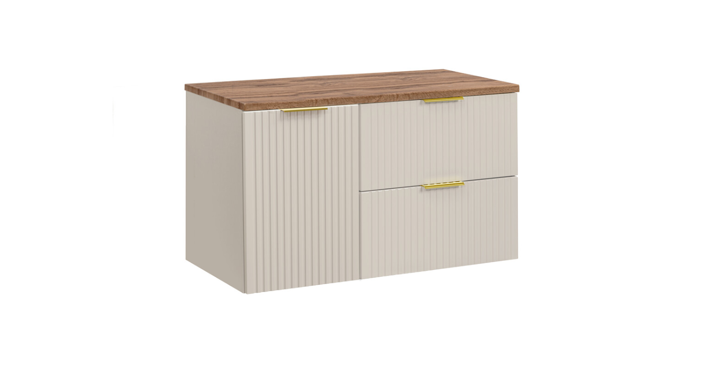 Vylepšite svoju kúpeľňu s nádhernými kúpeľňovými skrinkami ADEL Cashmere! Ich moderná béžová farba dodá vašej kúpeľni svetlý a svieži vzhľad, zatiaľ čo drevený dekor dosky pod umývadlo vytvorí príjemný kontrast. Zostava s doskou ADEL Cashmere D100/1 obsahuje dve skrinky a dosku. Minimalistické prevedenie oživujú vertikálne drážkované čelá, ktoré sú moderné a žiadané. Výhodou je aj možnosť výberu farby úchytiek, pretože každá skrinka je dodávaná s tromi farebnými úchytmi: zlatý lesk, chrómový lesk a čierny mat. Vďaka tomu je možné farebne doladiť úchytky ku kovaniu, zrkadlá v rôznych farbách rámu, či osviežiť vzhľad nábytku v budúcnosti.