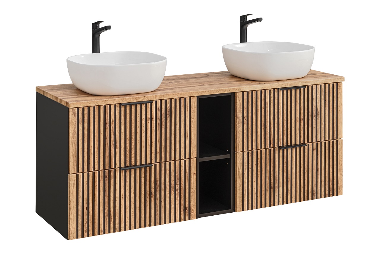 Moderná kúpeľňová skrinka s umývadlom a doskou XILO DU140/1 v dekore dub wotan to nie je len kvalita a moderný dizajn, ale aj pohodlie a funkčnosť. Výrazný dekor dreva dub wotan v kombinácii s čiernym drážkovaním je novinkou na trhu s nábytkom, ktorá je čoraz obľúbenejšia. Vďaka kvalitným materiálom a modernému prevedeniu vám dlho bude robiť radosť.