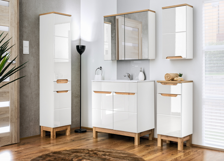 Moderný dizajn v kombinácii s kvalitnými materiálmi vytvára dojem čistoty a elegancie, to sú skrinky do kúpeľne BALI White. Skrinka pod umývadlo BALI White 823 v šírke 40 cm je vhodná menších kúpeľní alebo na toaletu. Skrinka má jedny dvierka a jednu zásuvku. Biely lesk v kombinácii s teplým dreveným dekorom pôsobí luxusne. Vaša kúpeľňa bude vyzerať sviežo a moderne, kombinácia lesku s dekorom dreva vytvára harmóniu, ktorá sa hodí do každej kúpeľne.