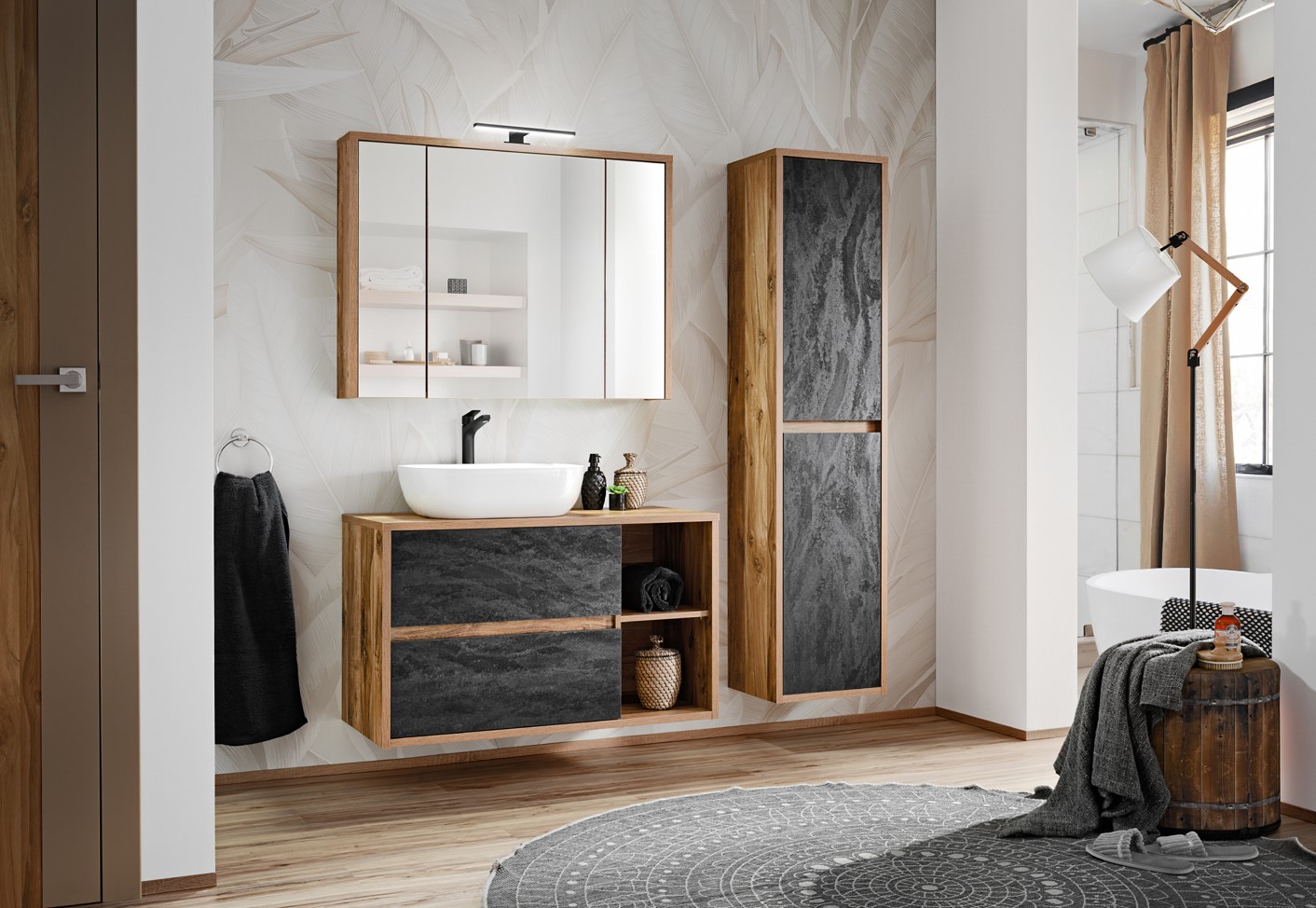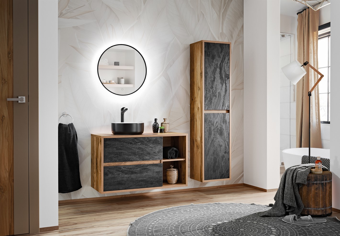 Surový loftový štýl je viac než len trend – je to životný štýl pre tých, ktorí ocenia originalitu, modernosť a nekonvenčné riešenia vo svojom interiéri. Kúpeľňová kolekcia HAMPTON prináša do vášho domova harmonické spojenie klasických prvkov, elegancie a moderných riešení. Betónové čelá vytvárajú pôsobivý kontrast s teplým odtieňom dubu Hunton, čo dáva kúpeľňovému nábytku jedinečný charakter. Skrinka pod umývadlo HAMPTON 824 má dve zásuvky, ktoré sú vybavené tichými dojazdmi a integrovaným podúchytovým otváraním.