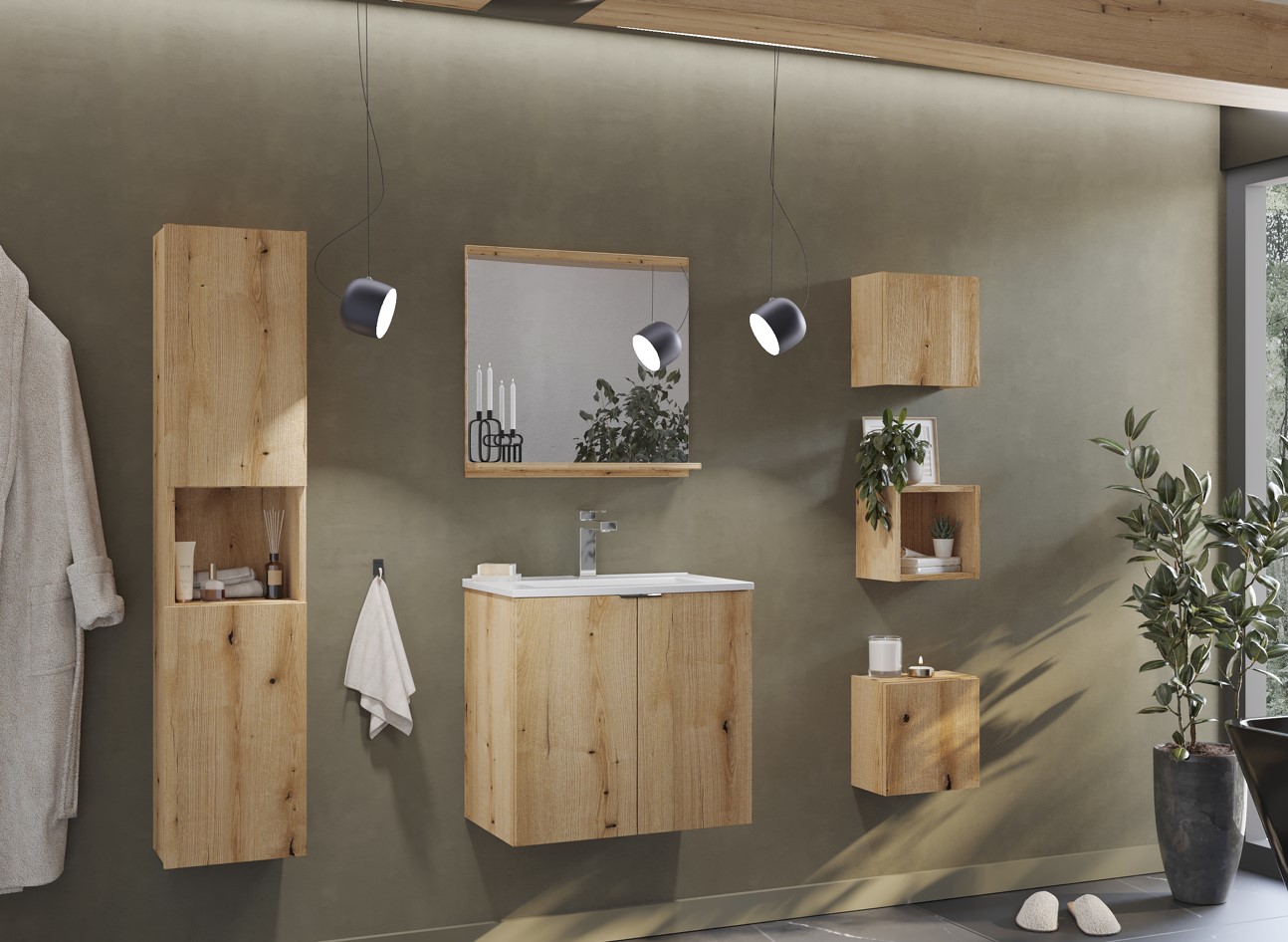 Skrinka pod umývadlo NOVA Oak 82-60-2D s dvierkami, ktoré sú vybavené tichými dovieraním, má jednu vnútornú policu. Kolekcia je navrhnutá s menšou hĺbkou kúpeľňových skriniek, ktorá je ideálnym riešením pre menšie interiéry pri zachovaní plného pohodlia a použiteľnosti. Spolu s kúpeľňovými kolekciami LINE REED GREEN a NOVA Black umožňuje flexibilné prispôsobenie individuálnym potrebám.