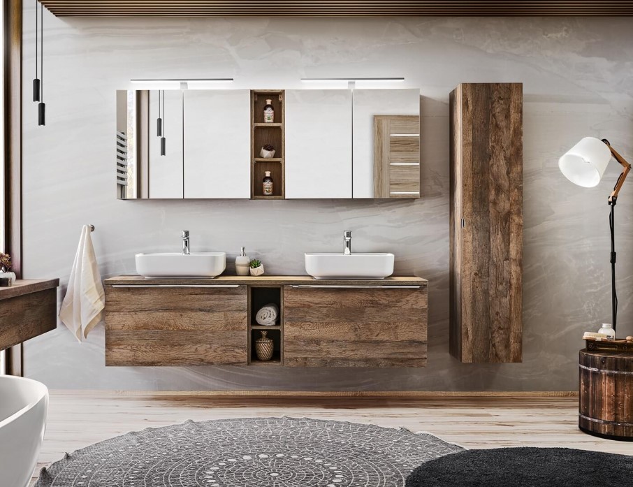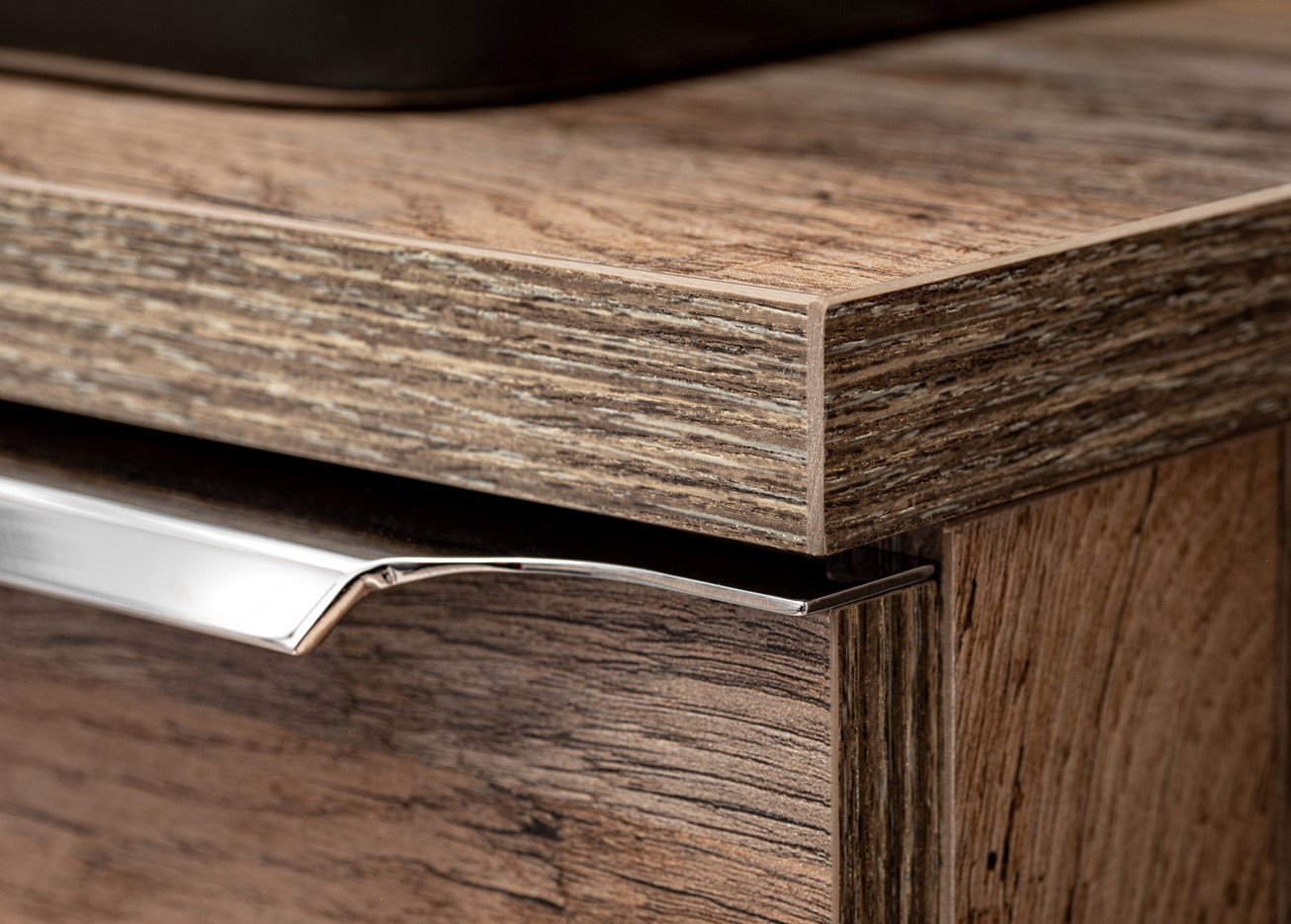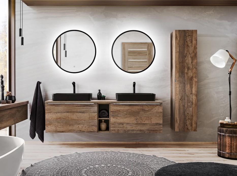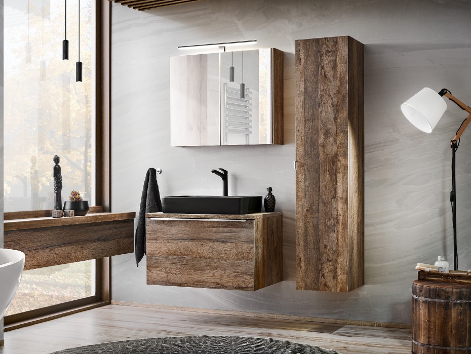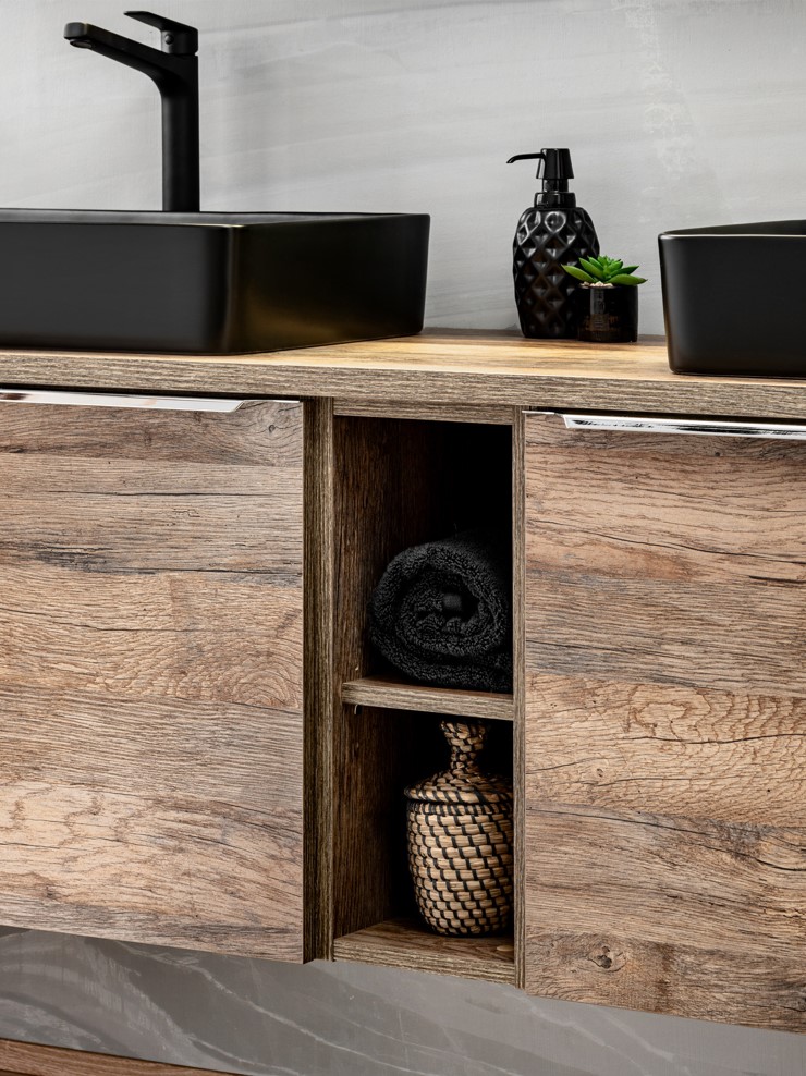 Kúpeľňová zostava SANTA Fe Oak v prevedení dub santa fe je ideálnym riešením pre každú kúpeľňu. Táto nádherná kolekcia kombinuje štýl, funkčnosť a kvalitu v jednom. Dub santa fe, v ktorom je táto zostava dostupná, vnáša do kúpeľne teplý a prírodný pocit. Kúpeľňový nábytok je vyrobený z kvalitných materiálov, ktoré zabezpečujú dlhú životnosť a odolnosť proti vlhkosti a každodennému opotrebovaniu. Skrinka pod umývadlo SANTA FE Oak 82-80 má dve zásuvky, ktoré sú vybavené tichými dojazdmi. Súčasťou vnútornej zásuvky je praktický organizér. Okrem toho môžete skrinku pod umývadlo SANTA FE Oak 82-60 doplniť doskou pod umývadlo v prevedení dub santa fe, aby ste si zabezpečili jednotný a esteticky vzhľad. Elegantný vzhľad kúpeľňových skriniek znásobuje chrómová úchytka. Kúpeľňová kolekcia SANTA Fe Oak je navrhnutá výhradne pre umývadlá na dosku.
