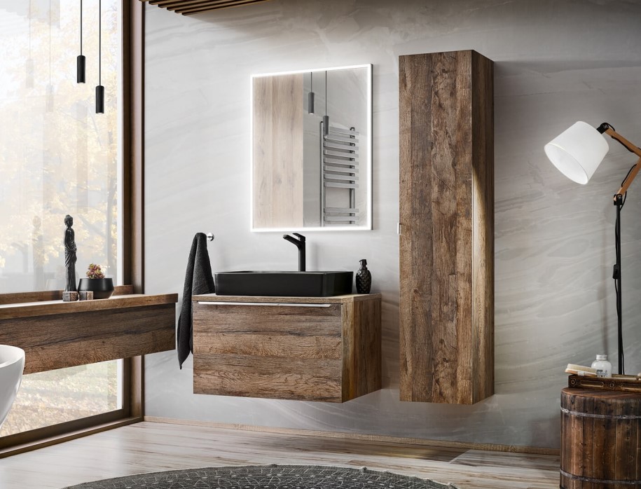Kúpeľňová zostava SANTA FE Oak v prevedení dub santa fe je ideálnym riešením pre každú kúpeľňu. Táto nádherná kolekcia kombinuje štýl, funkčnosť a kvalitu v jednom. Dub santa fe, v ktorom je táto zostava dostupná, vnáša do kúpeľne teplý a prírodný pocit. Kúpeľňový nábytok je vyrobený z kvalitných materiálov, ktoré zabezpečujú dlhú životnosť a odolnosť proti vlhkosti a každodennému opotrebovaniu. Vysoká kúpeľňová skrinka SANTA FE Oak 80-01 má štyri police a dve vnútorné zásuvky. Dvierka sú vybavené tlmeným dovieraním, ich montáž je možná v pravej aj ľavej variante.