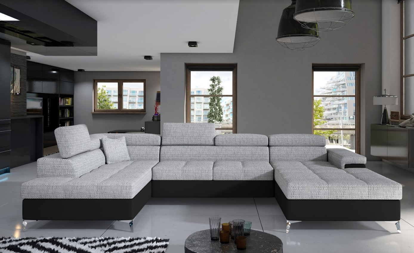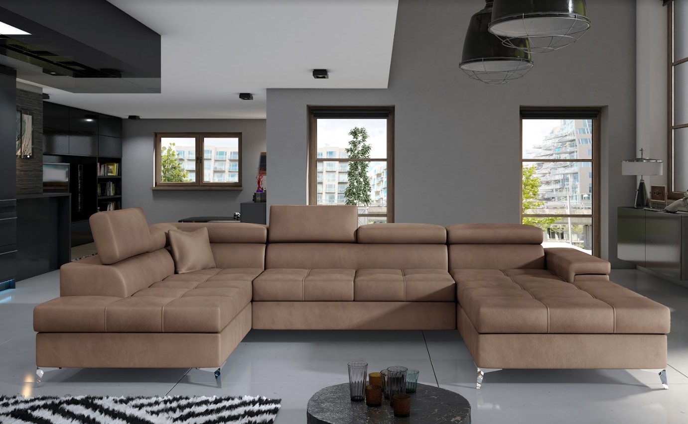 Vytvorte si z obývacej izby atraktívny priestor s dizajnovou sedacou súpravou EDUARDO v tvare U. Vďaka vyšším nohám z chrómovej ocele pôsobí konštrukcia sedačky odľahčene, pričom však nestráca na stabilite. Mimoriadny dizajn dodáva pohovke pútavé prešívanie sedenia, komfort užívania zvyšuje možnosť polohovania hlavovej opierky. Vďaka čalúnenej zadnej strane je vhodná aj do priestoru. Veľkým plusom je úložný priestor a možnosť rozloženia na spanie, vďaka veľmi intuitívnemu systému delfín bude ľahké získať miesto na spanie s plochou až 125 x 265 cm. Spravte si z obývacej izby harmonický a zladený celok vďaka originálnej sedačke EDUARDO v ľavom prevedení.