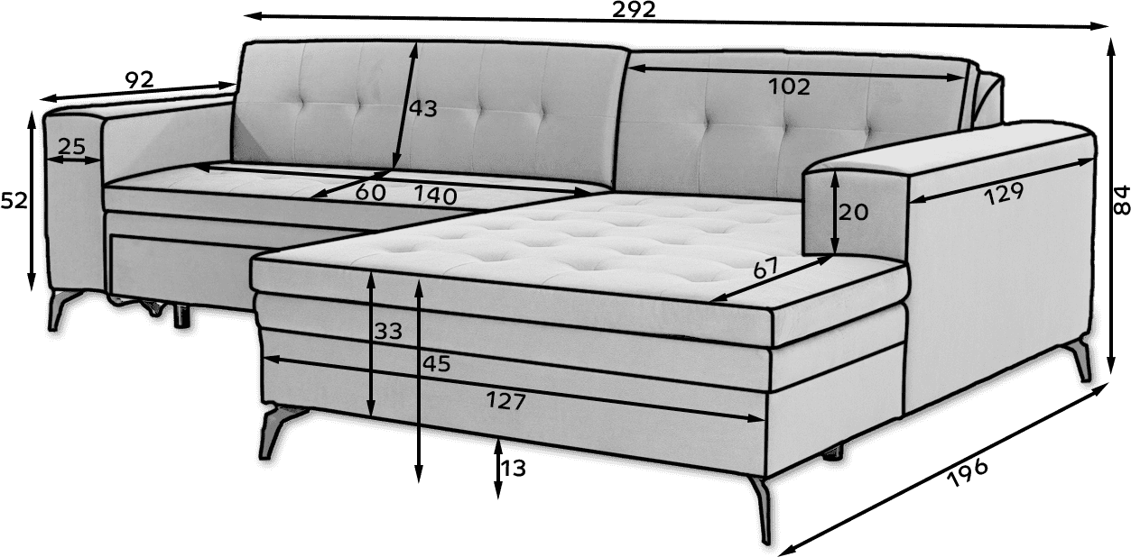 Moderné interiéry sa vyznačujú jednoduchosťou a eleganciou, rohová sedacia súprava SOLANGE sa do tohto štýlu dokonale hodí. Vďaka svojmu tradičnému a jednoduchému rozloženiu sa stane sedacia súprava Solange pravou dominantou obývacej izby. Priestranné sedenie, vhodne tvarované operadlo, jemne zaoblené opierky – to všetko dotvára estetiku sedacej súpravy. Štýlové vysoké nohy a jemné prešívanie umiestnené na celom povrchu operadla a sedadla zvyšujú vizuálny zážitok. Sedacia súprava je rozkladacia so spacou plochou o rozmere 210 x 126cm. Je vhodná aj do priestoru, nakoľko je čalúnená aj zo zadnej strany.