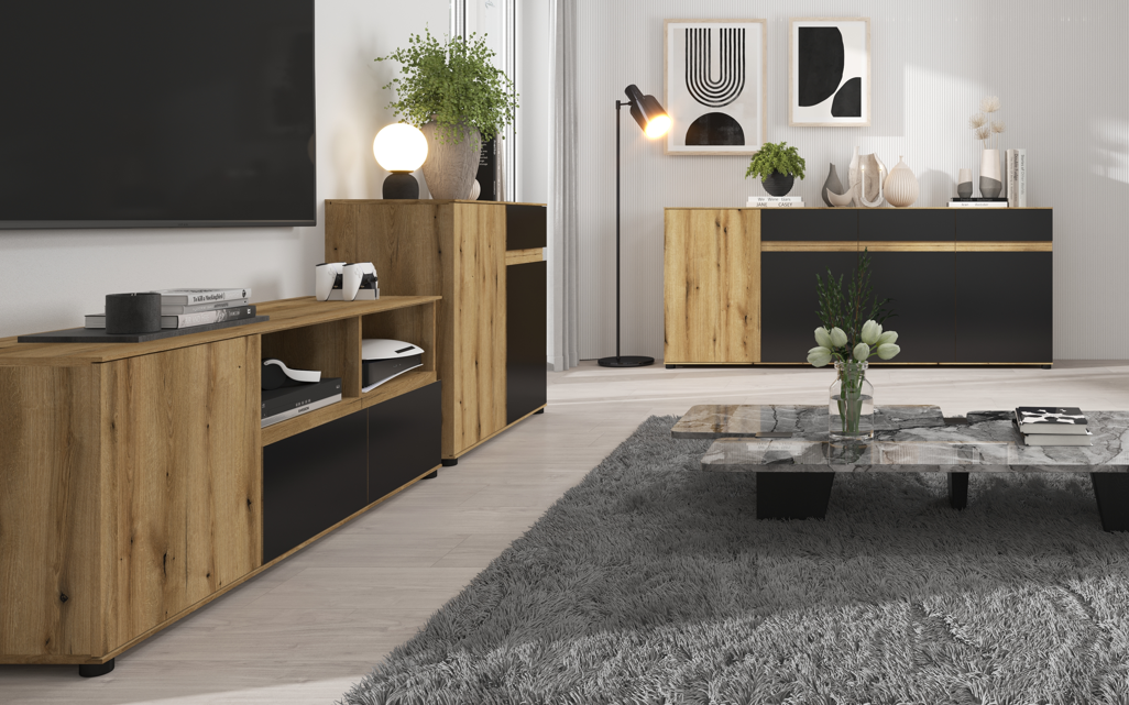 BIM Komoda Woody 4D, 180 cm, čierny mat/pacifický orech