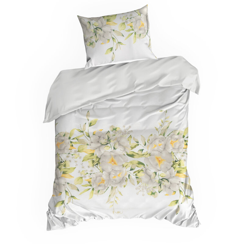 Posteľná súprava z bavlneného saténu s potlačou Šírka: 220 cm, Dĺžka: 200 cm, Farba: biela, Hmotnosť: 115 GSM, Zloženie: satén, 100% bavlna. Balenie obsahuje 1 ks 220 x 200 cm, 2 ks 70 x 80 cm.