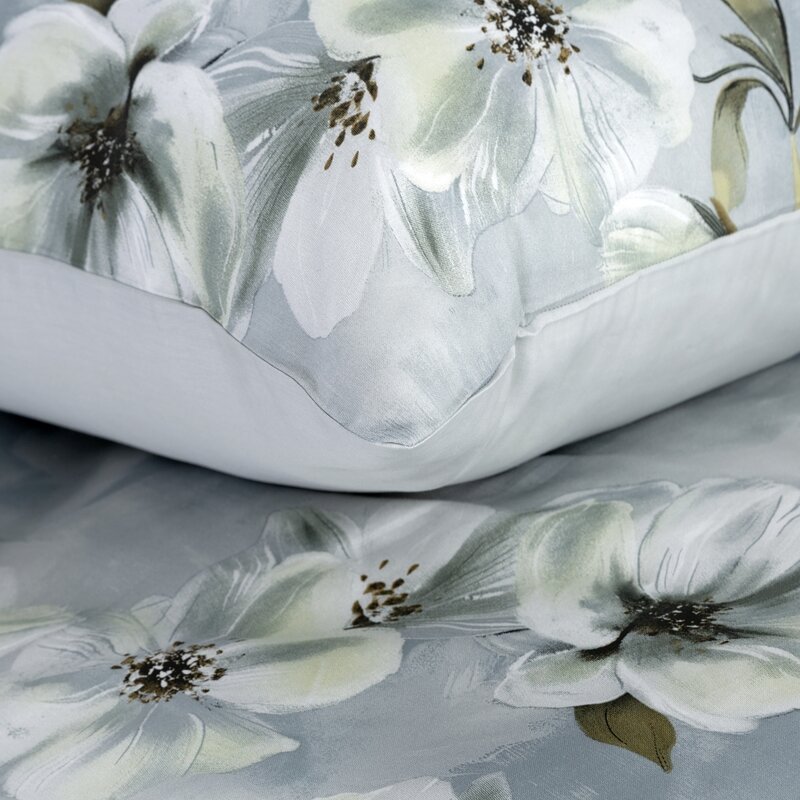 Posteľná súprava z bavlneného saténu s potlačou. Šírka: 220 cm, Dĺžka: 200 cm, Farba: svetlosivá, Hmotnosť: 115 GSM, Zloženie: satén, 100% bavlna. Balenie obsahuje 1 ks 220 x 200 cm, 2 ks 70 x 80 cm.