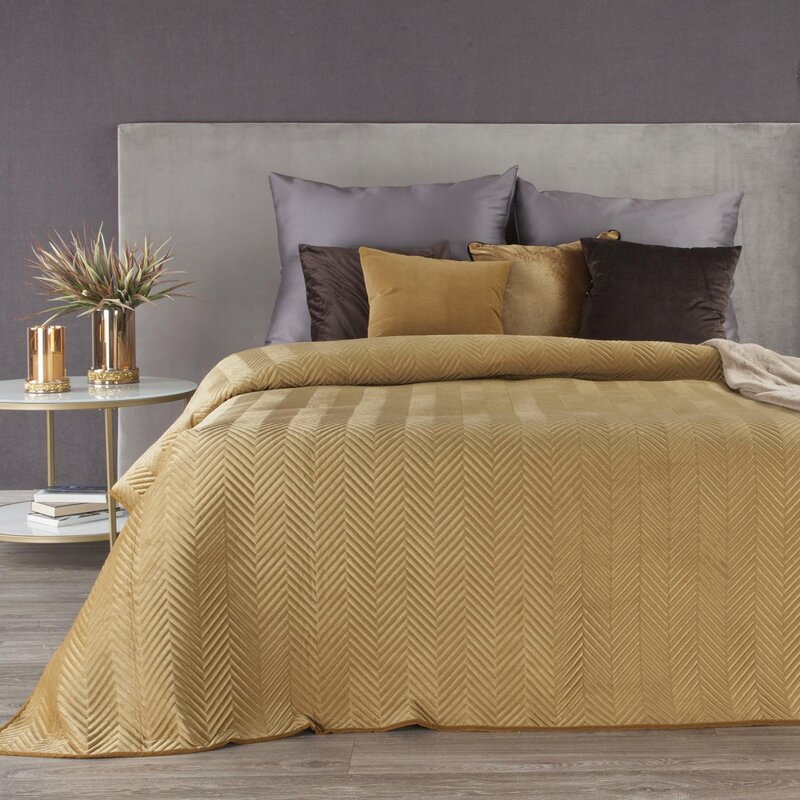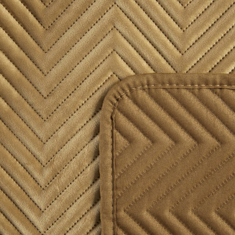 Exkluzívny prehoz na posteľ z mäkkého a na dotyk príjemného zamatu prešívaného veľkým hustým vzorom rybej kosti. Na prešívanie sa použila bezšvová metóda horúceho lisovania. Šírka: 200 cm, dĺžka: 220 cm, farba: medová, gramáž: 250+120+65 GSM, zloženie: Materiál: 100% polyester.