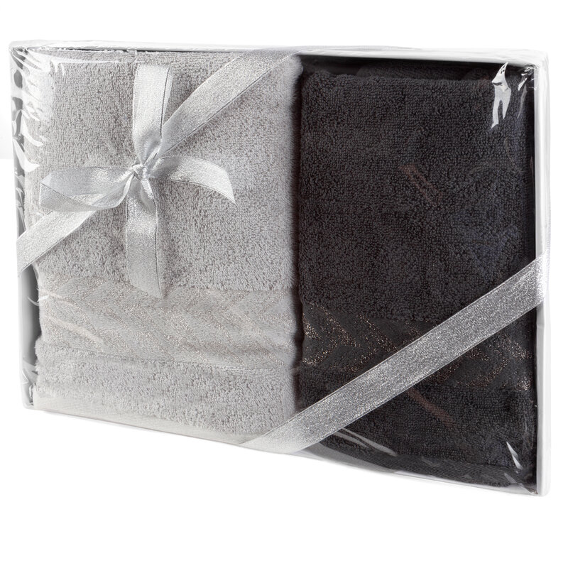 farba: strieborná, hmotnosť: 450 GSM, zloženie: Materiál: 100% bavlna, 100% polyester. Sada obsahuje 1 ks 50 x 90 cm a 1 ks 70 x 140 cm.