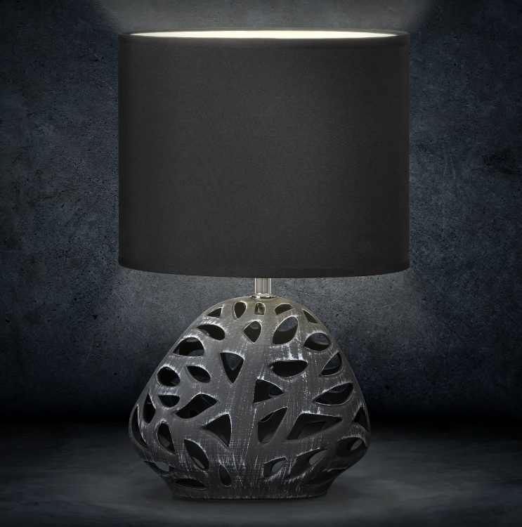 Stolová lampa DAKOTA s keramickou základňou je štýlovým doplnkom pre moderné interiéry. Cibuľovitá základňa s prelamovanými výrezmi má dodatočnú úpravu, ktorá jej dodáva vzhľad starého, elegantne opotrebovaného kúsku. Táto lampa bude vyzerať skvele na komode alebo nočnom stolíku vo vintage alebo škandinávskom štýle. Výrazná čierna základňa je doplnená tienidlom z hladkej matnej tkaniny. Bodové osvetlenie je vynikajúcim spôsobom, ako vytvoriť príjemnú atmosféru v interiéri.